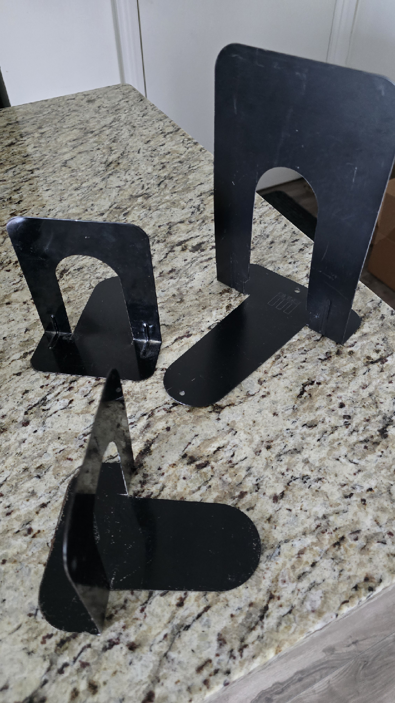 Giving away a set of black metal bookends! They're perfect for keeping your books organized and upright on any shelf or desk. They have some signs of use.
