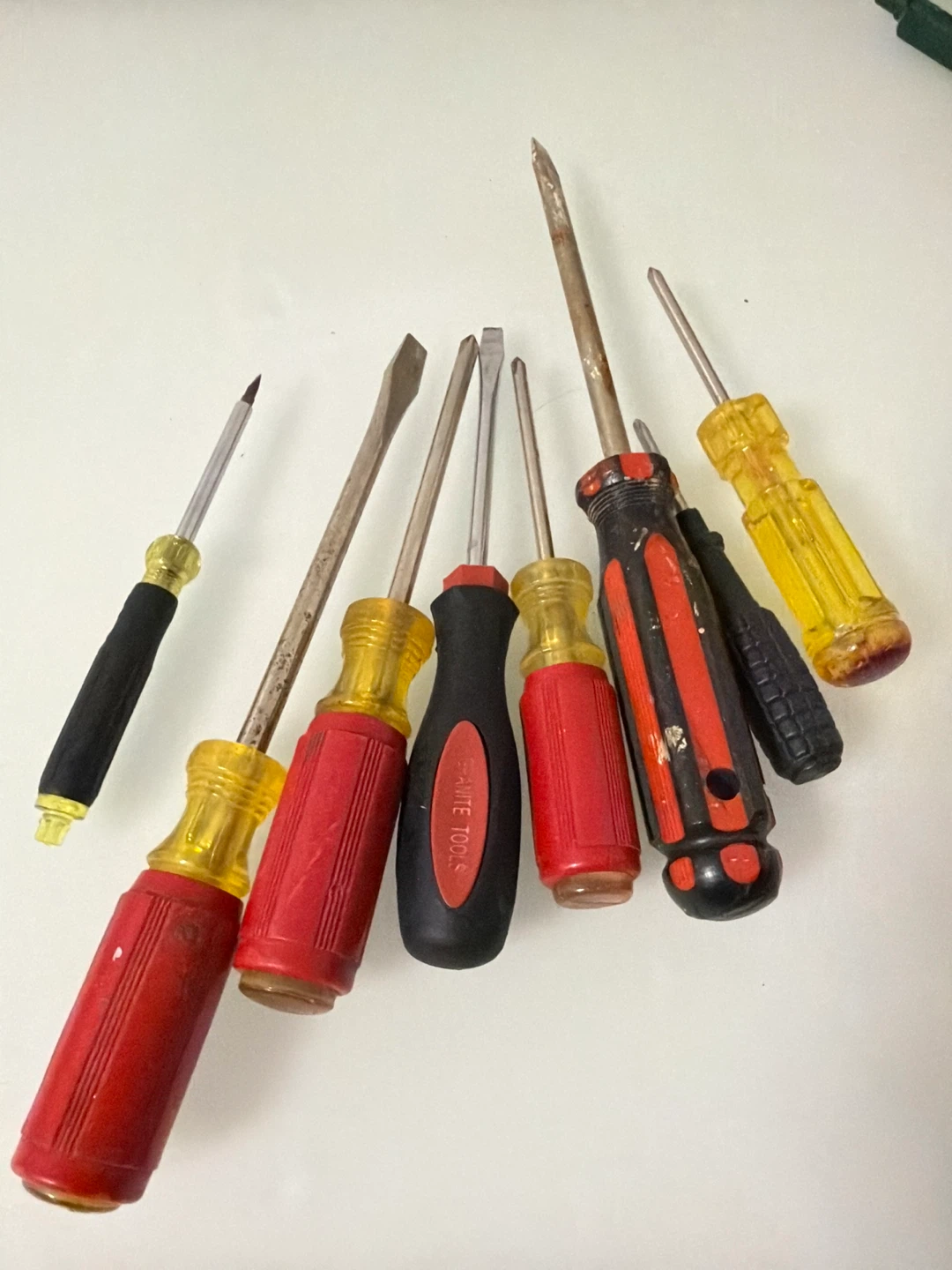 Selling a used screwdriver set. There are 7 screwdrivers with different sizes and head types. The handles are red, black and yellow. Good for various household tasks