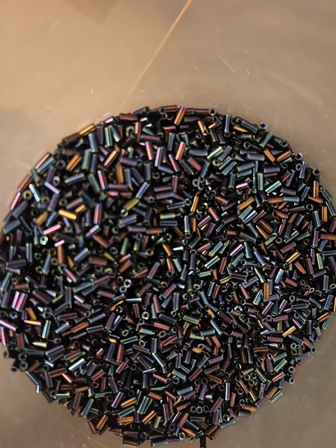 245A large, shimmering lot of iridescent glass bugle beads with a stunning rainbow metallic finish! These tubular beads gleam in deep shades of blue, violet, gold, and green, perfect for jewelry making, bead embroidery, or decorative crafts. Details: • Material: Glass • Shape: Bugle / tube beads • Finish: Iridescent metallic (AB / rainbow iris) • Size: approx. 3–4 mm long • Quantity: ~1⅝ cups total (very large lot) • Condition: Excellent; unused, clean, and stored well • Color tones: shifting blue, purple, and bronze hues Ideal for bracelets, necklaces, bead weaving, fringes, or embroidery. This generous lot offers a beautiful, consistent color mix with plenty to work on multiple projects. Can purchase the whole amount for $30 or $8 per quarter cup
