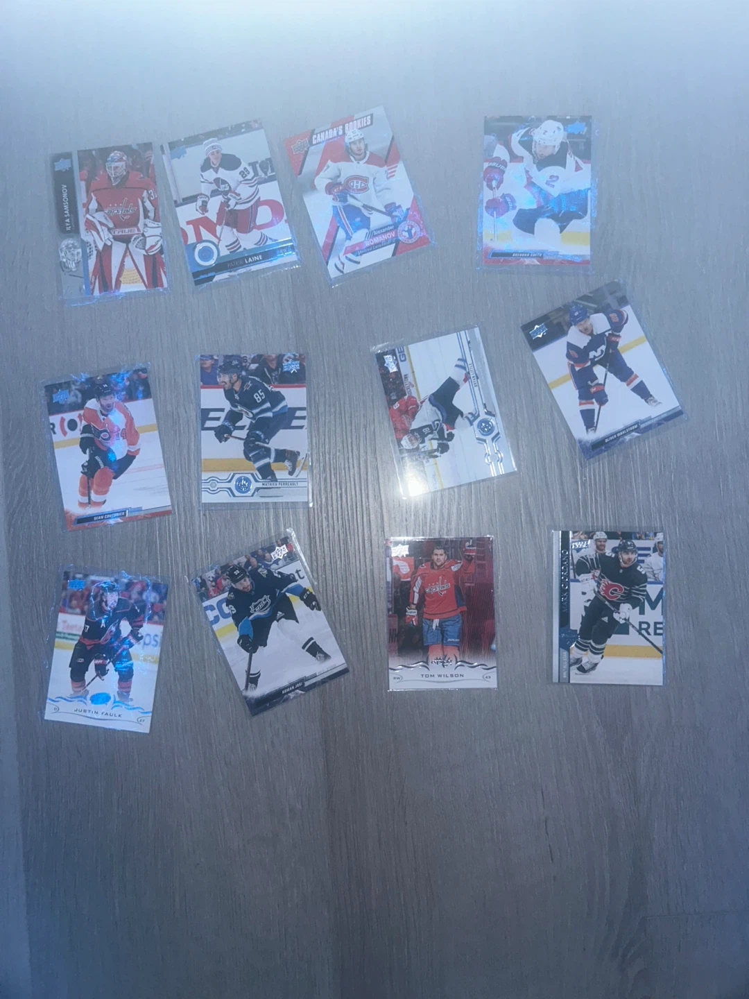 Selling a collection of hockey trading cards, featuring players like Ilya Samsonov, Patrik Laine, and Tom Wilson. These cards are from Upper Deck. Great for any hockey fan or collector!