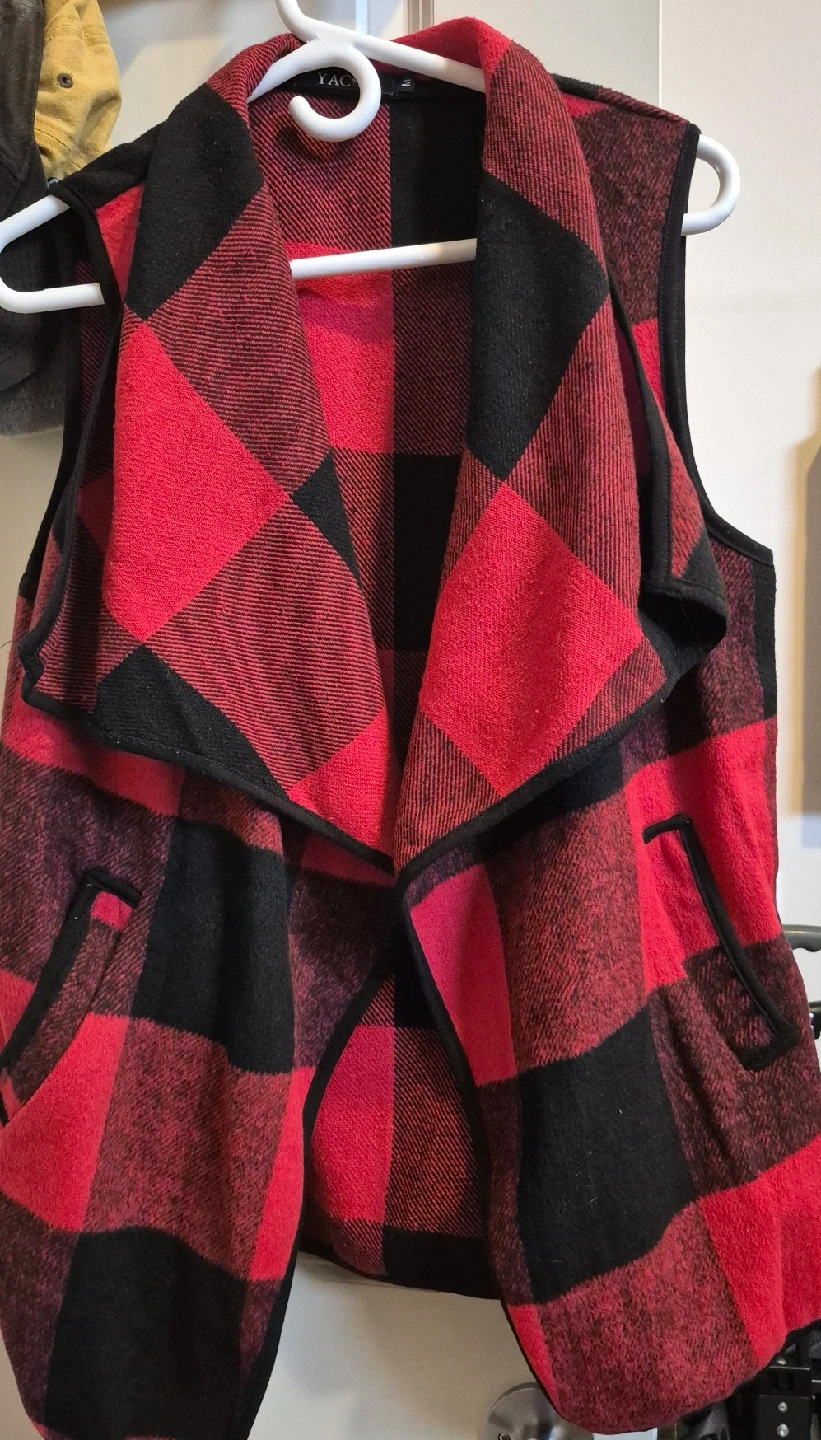 Cozy and stylish YAC vest in a classic red and black plaid pattern! It's a size medium and perfect for layering on those chilly days. The open-front design and soft material make it super comfy too!