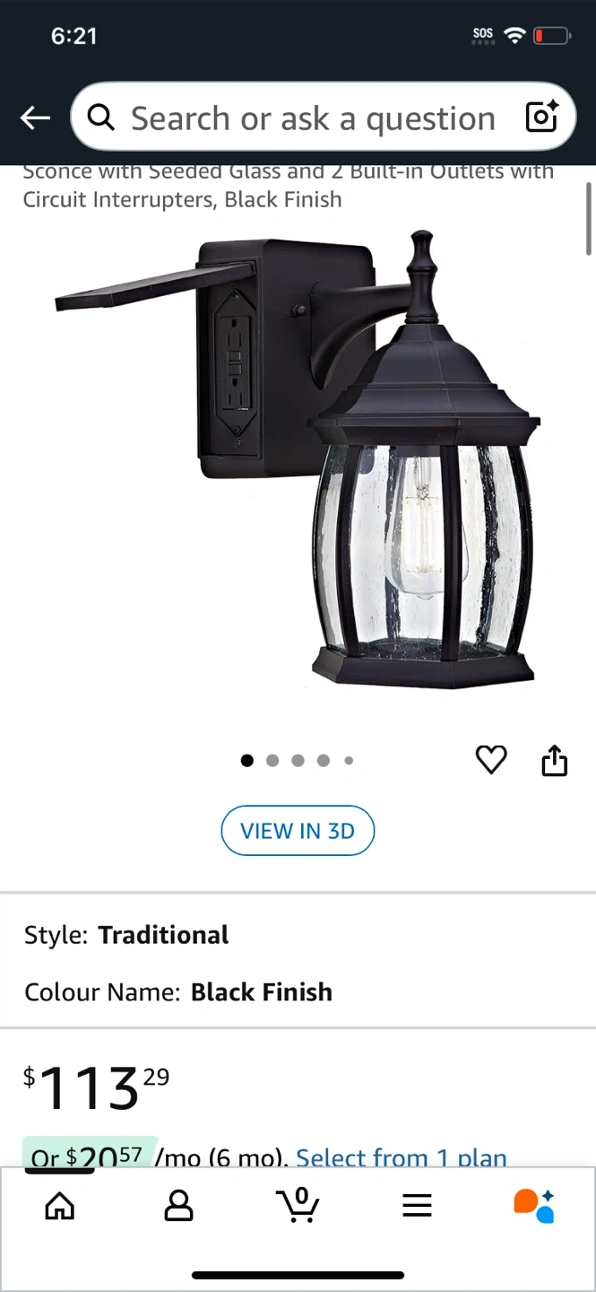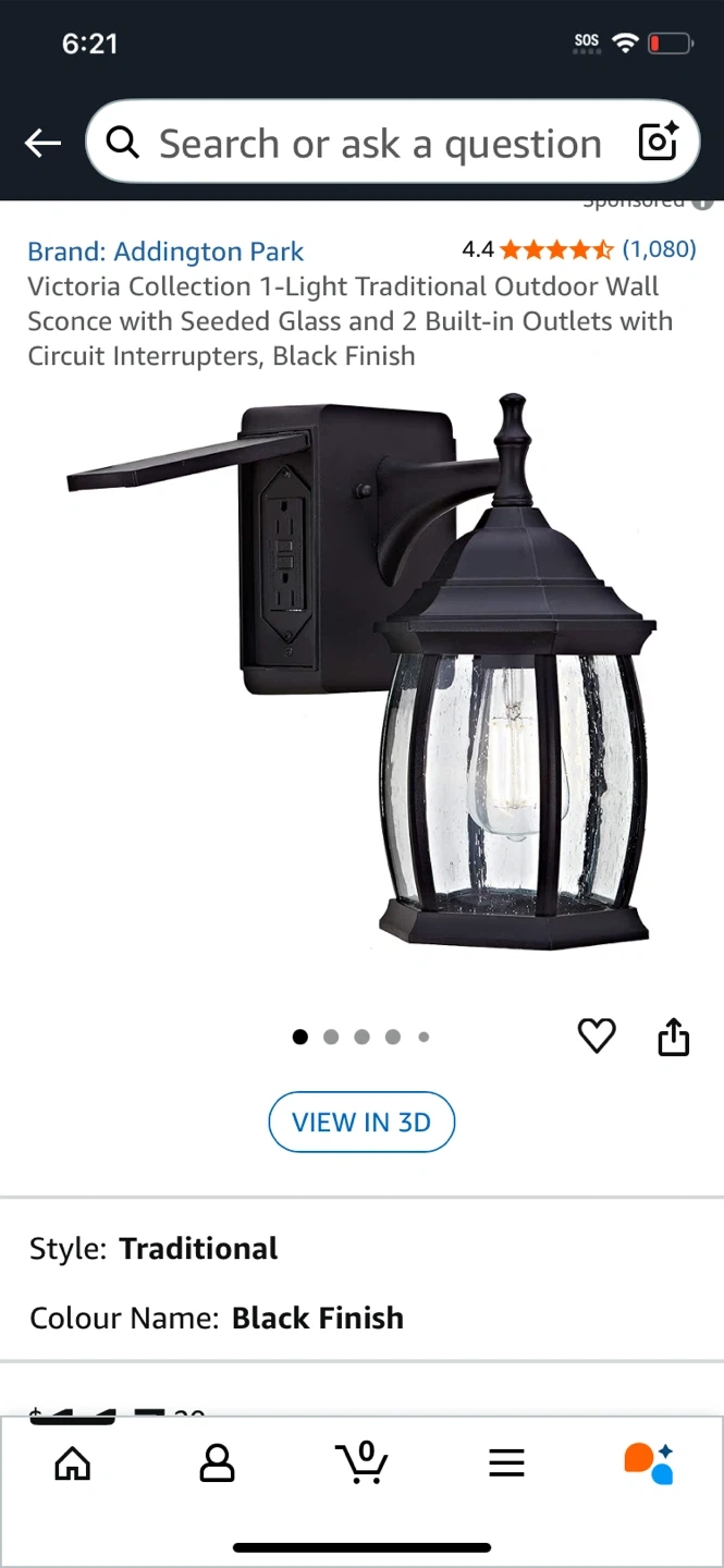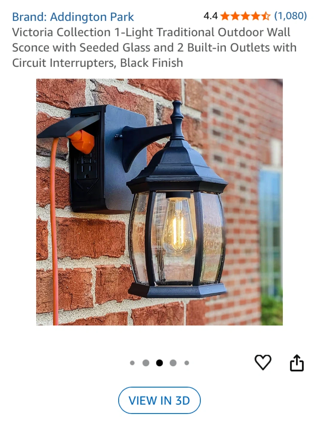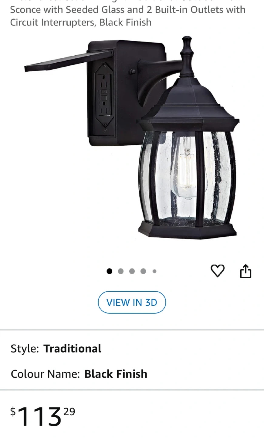 53Selling an Addington Park Victoria Collection 1-Light Traditional Outdoor Wall Sconce. It has seeded glass and 2 built-in outlets with circuit interrupters. It comes in a black finish. Originally bought for $113.29
