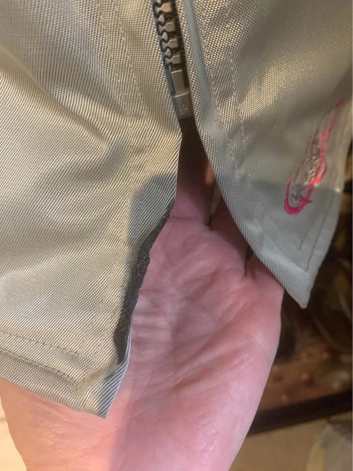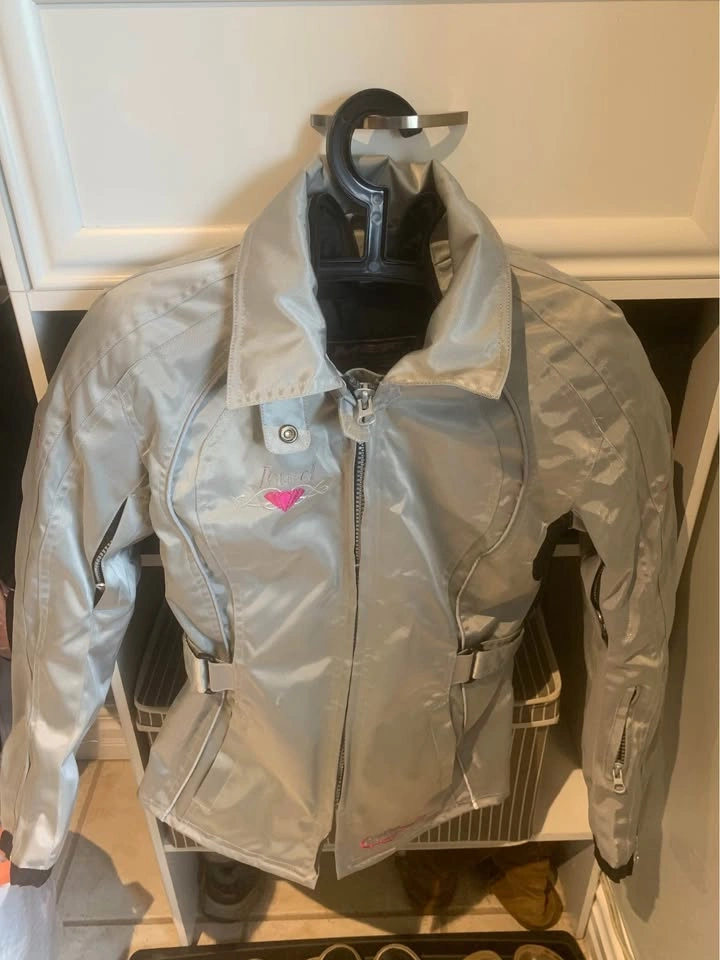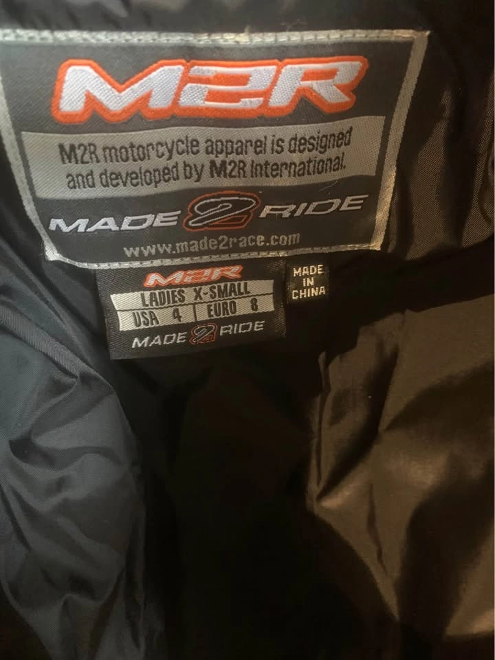15Ladies xs size 4. Has protective shoulders and elbows and inner zip in liner. Worn 3 times by my daughter as a passenger. Never had a spill. She did take her coat off after a ride and let it touch the pipe π€¦π½ββοΈ singed the bottom does not affect the coat or protection. See last pic. Fast pick up Burlington. Xposted.