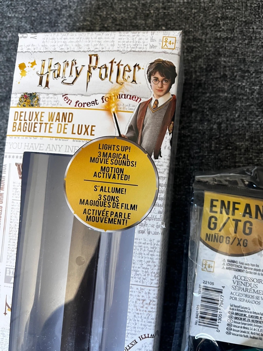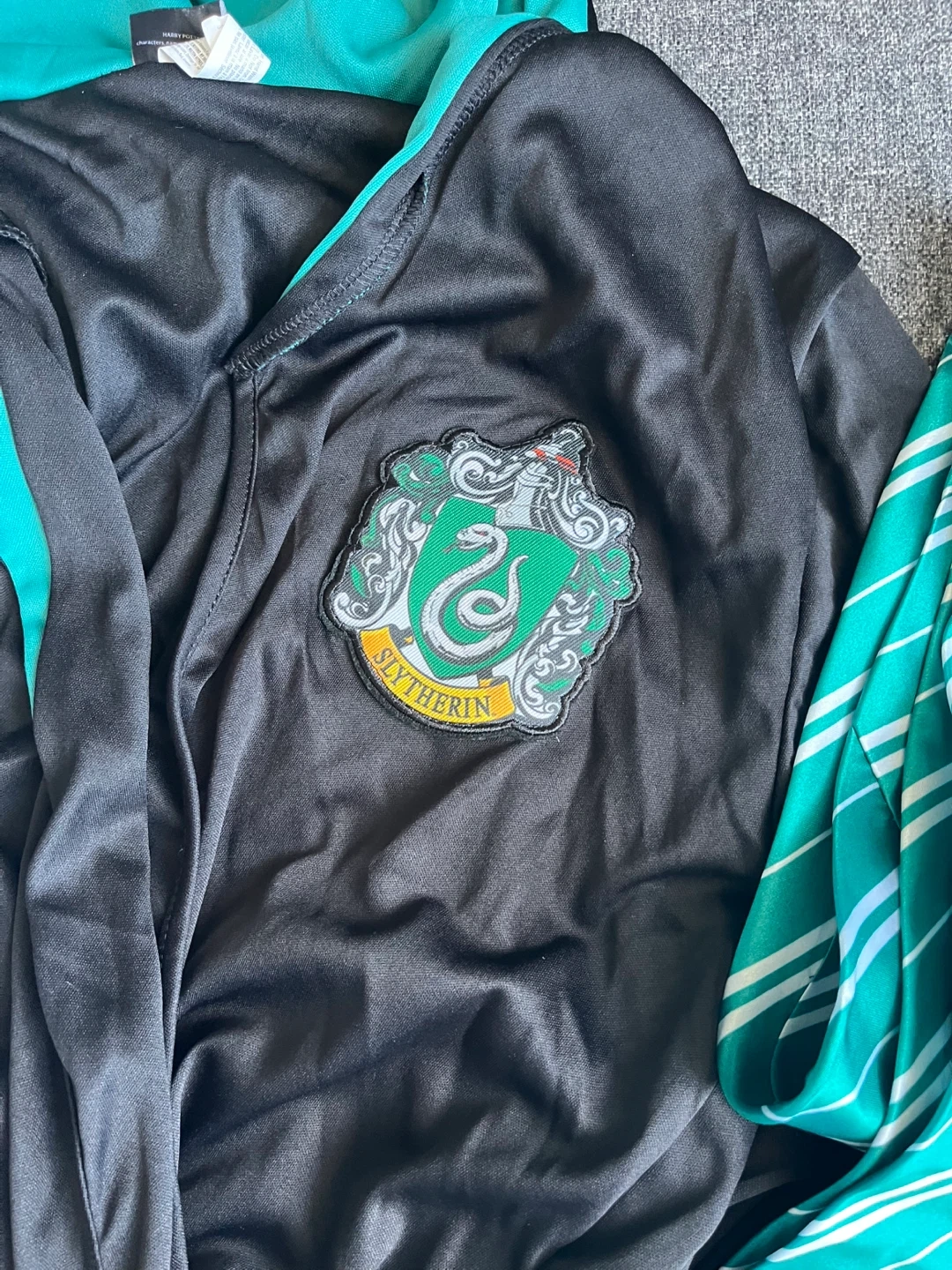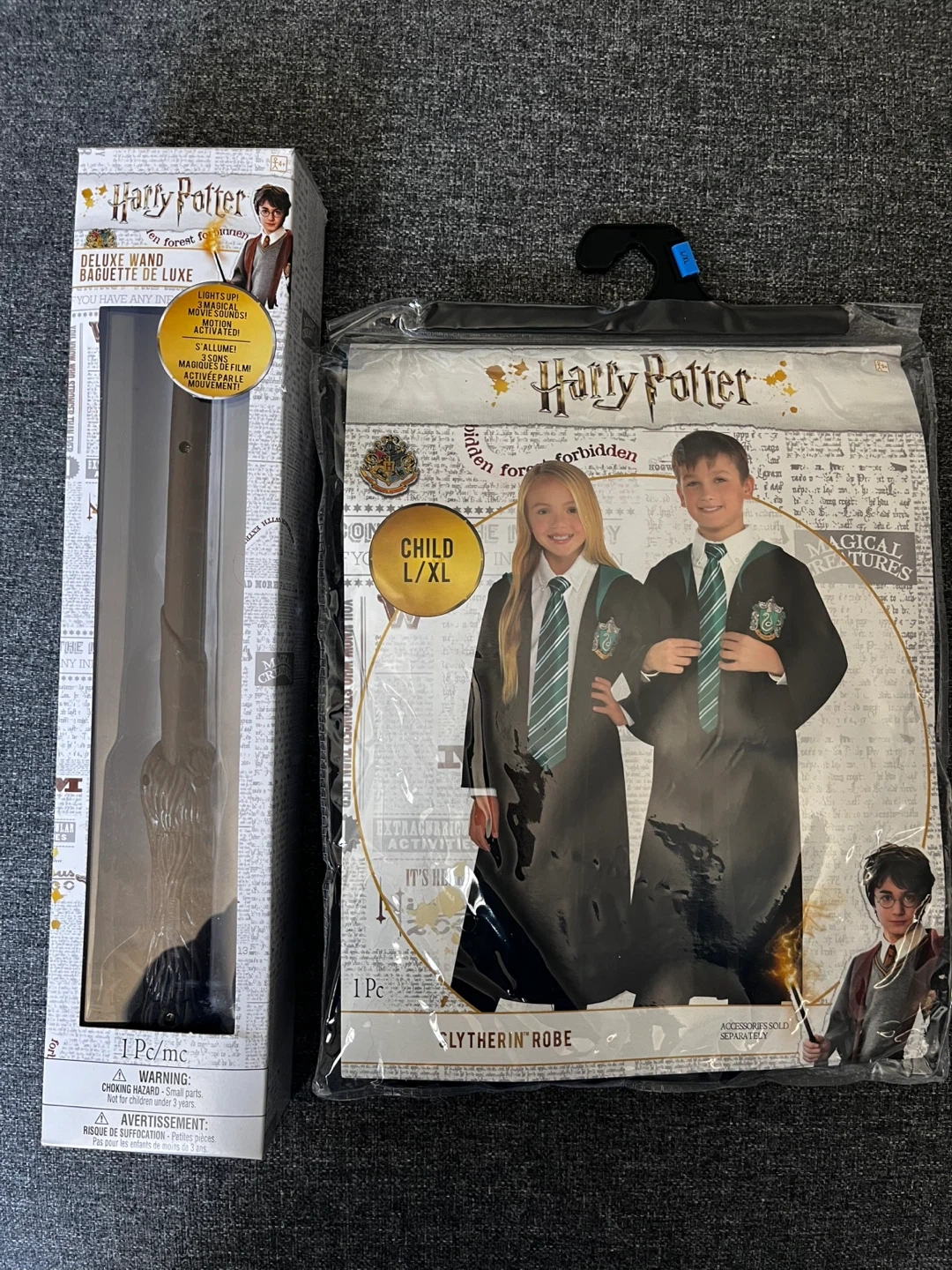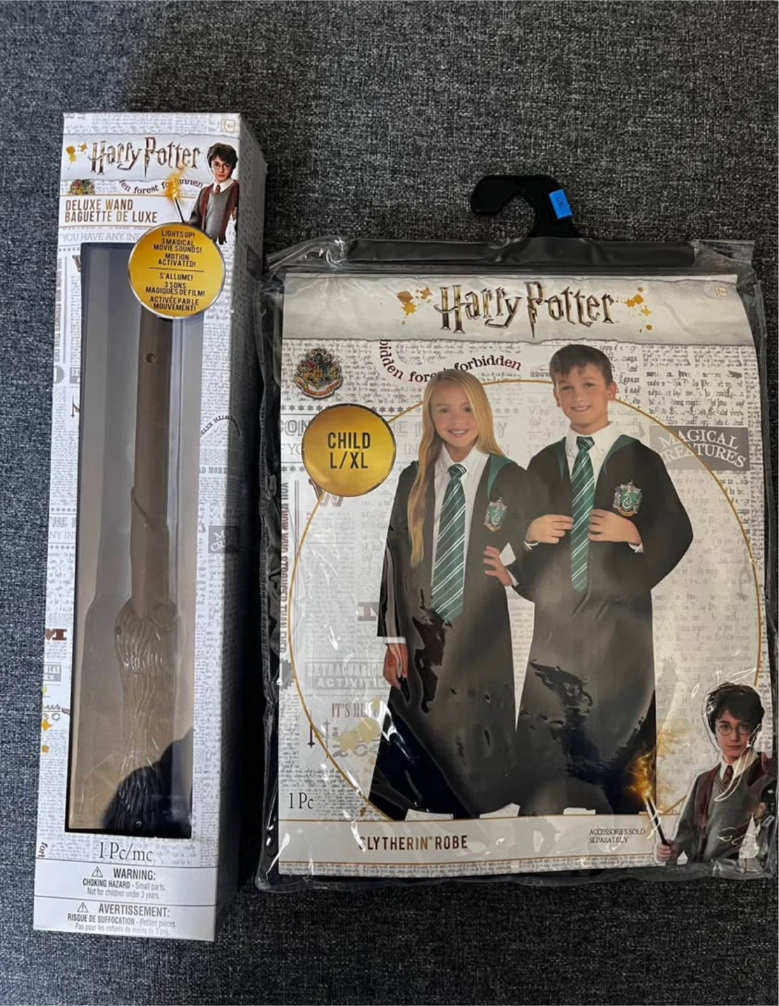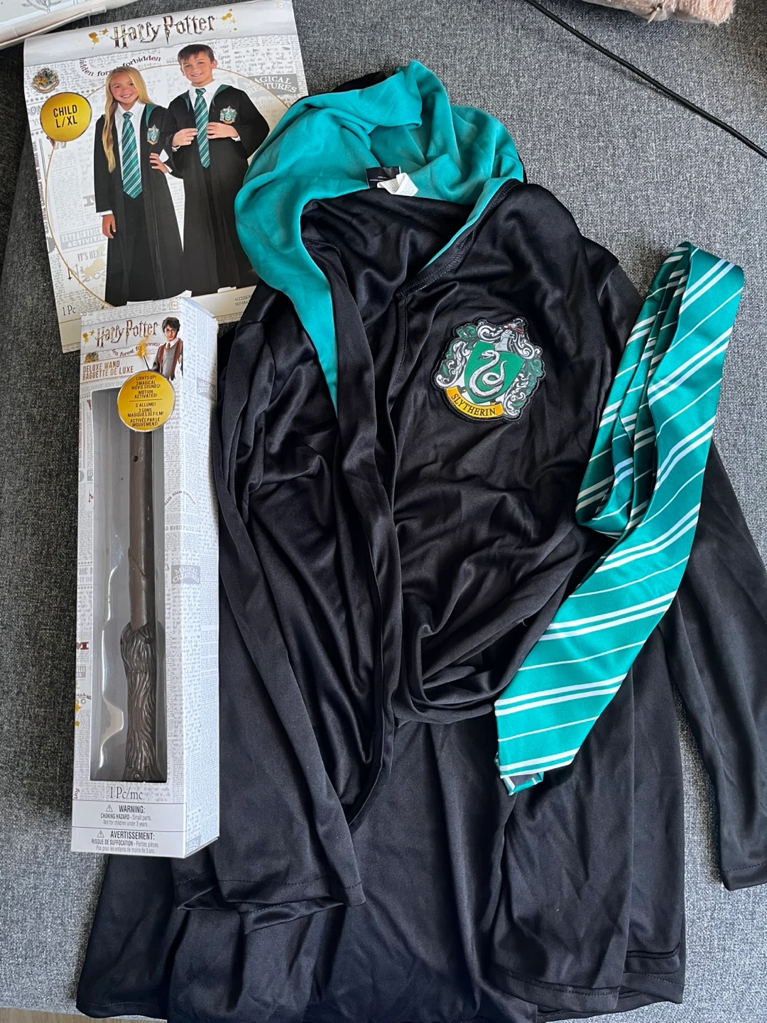 Get ready for some magical fun with this Harry Potter Slytherin robe and wand set! The robe is size L/XL for children fit up to 16 and the wand even lights up and makes movie sounds! Perfect for dress-up or Halloween