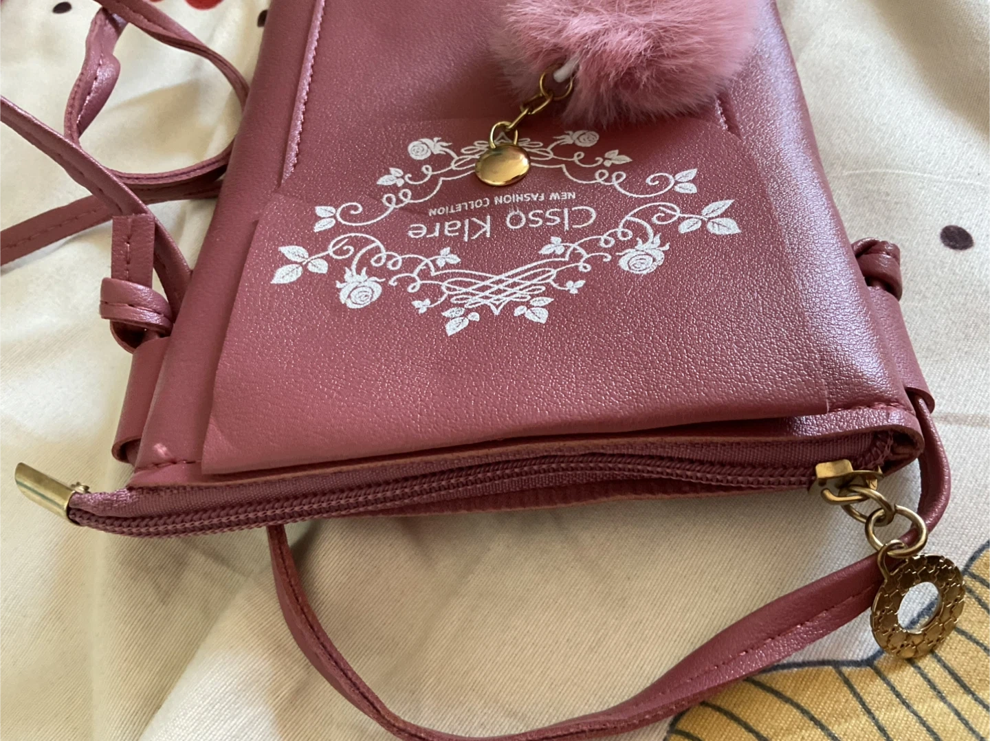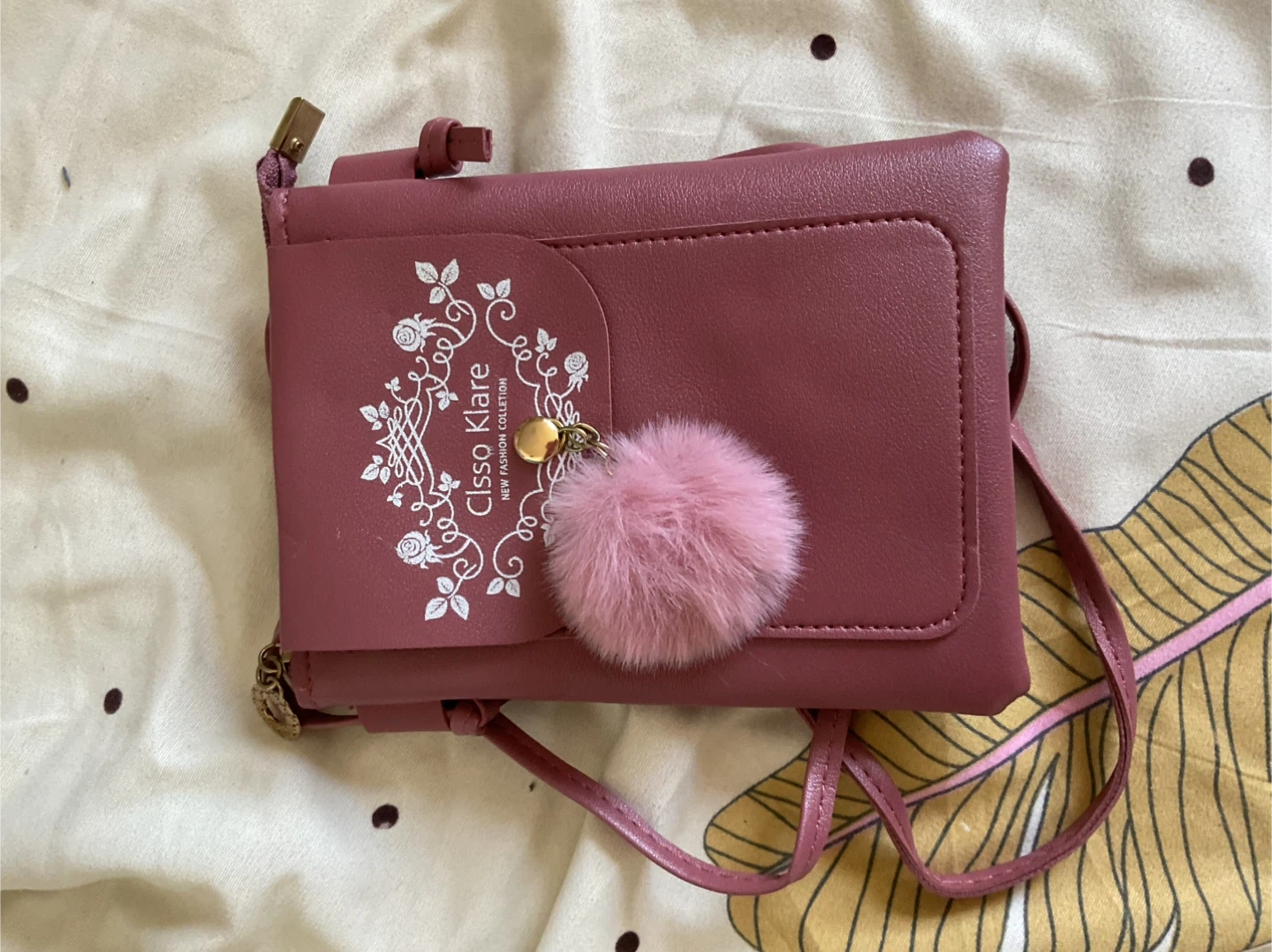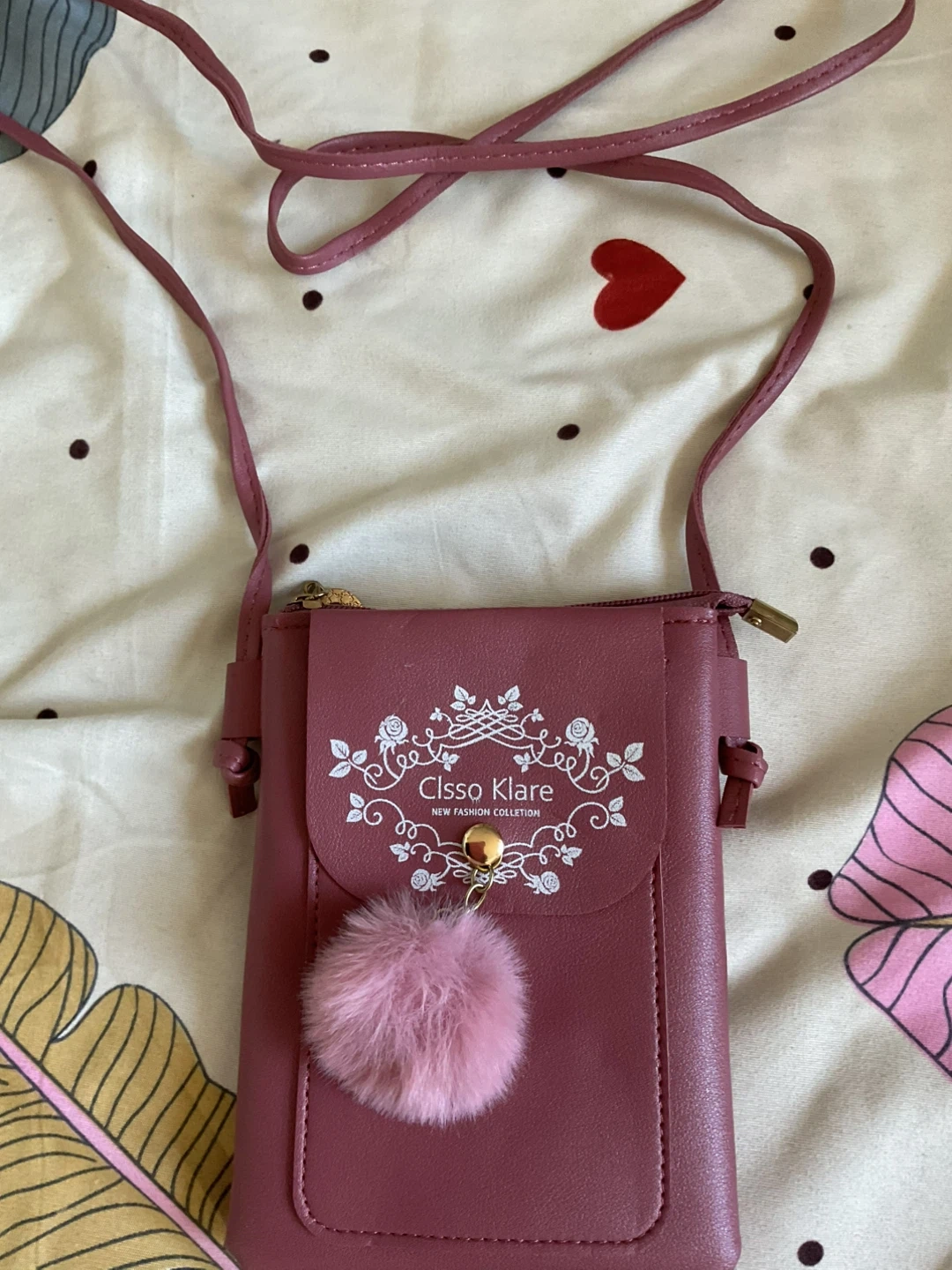 1000+A cute Cisso Klare crossbody bag in a lovely shade of pink! It features a stylish design with a floral pattern and a fluffy pom-pom detail. Perfect for carrying your essentials in style!
