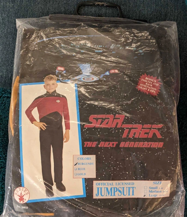 Get ready to boldly go where no one has gone before with this Star Trek: The Next Generation jumpsuit costume! This Rubies Official Licensed jumpsuit is perfect for any young Star Trek enthusiast. It's in New never worn condition, ready for your next convention, Halloween, or cosplay event. * Brand: Rubies * Character: Star Trek: The Next Generation If the ad is up, it's available.