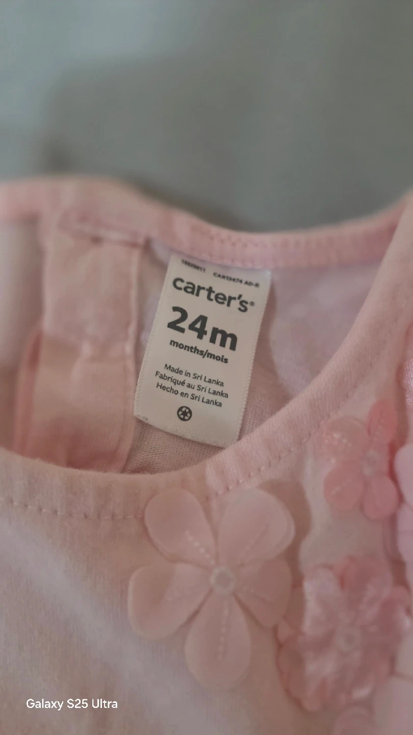 15A sweet pink dress from Carter's, perfect for your little one! It's in great condition and sized for 24 months. The dress features cute floral details on the bodice and a tulle overlay on the skirt, making it extra special