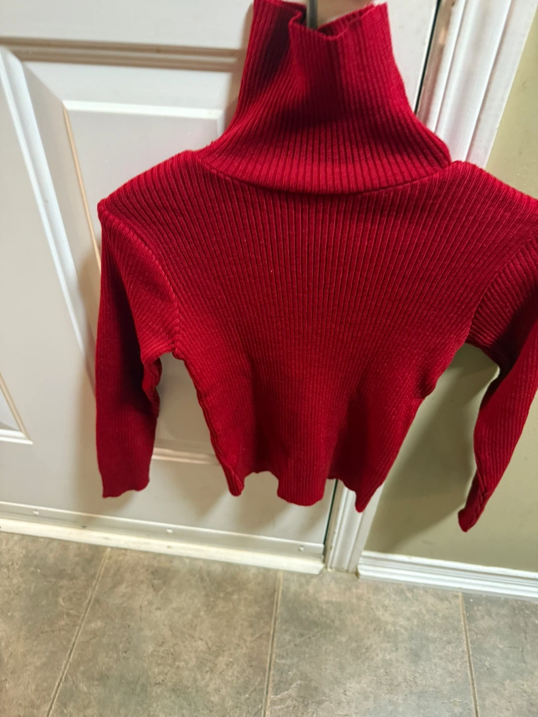 A cozy red turtleneck sweater, perfect for the cooler weather! It's a ribbed knit, giving it a nice texture. It's in great condition and ready for a new home