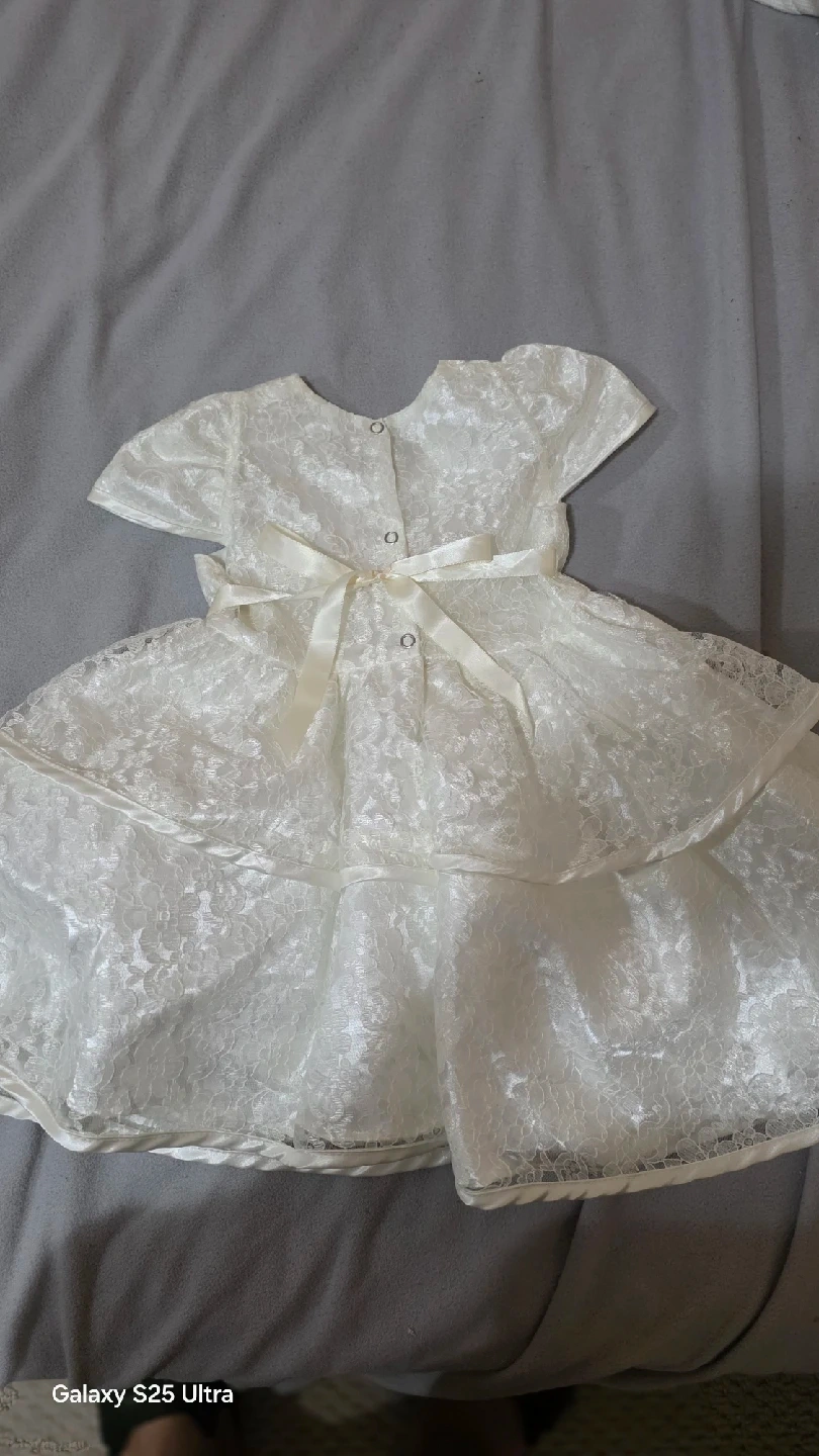 A beautiful white lace dress, perfect for a special occasion! It features short sleeves and a layered skirt design. The dress is in great condition and ready for a new home