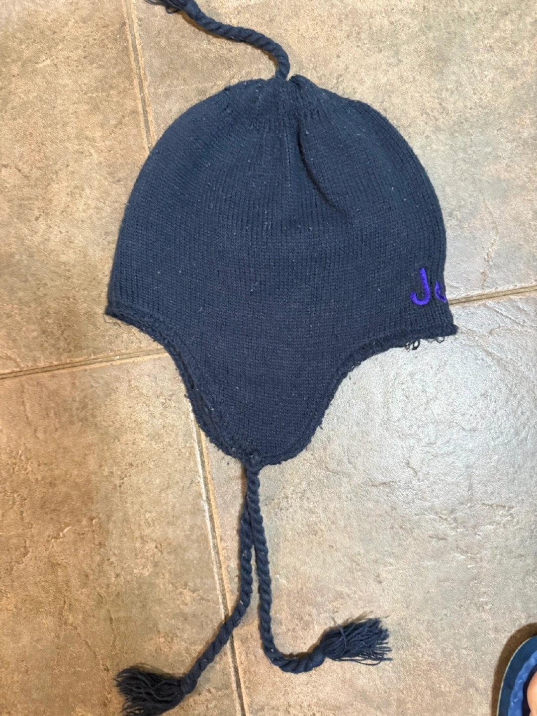 194Cozy blue knit trapper hat in good condition! It's perfect for keeping warm during the colder months. The hat features a classic trapper design with ear flaps and braided ties. It has a small embroidered detail on the side.
