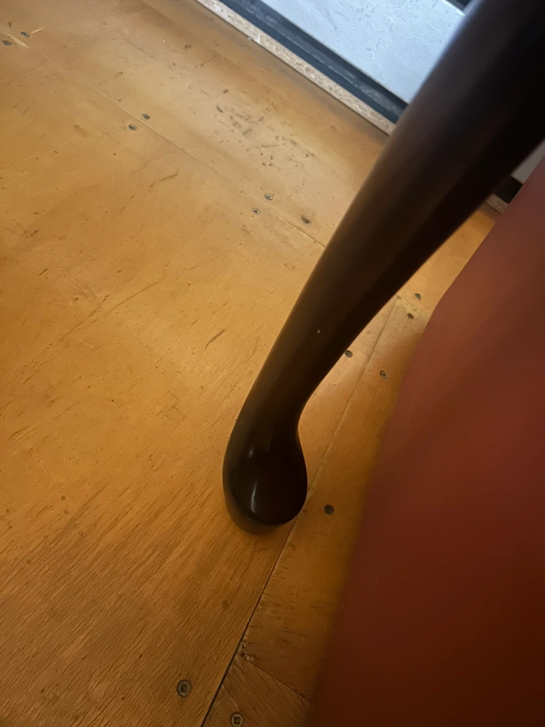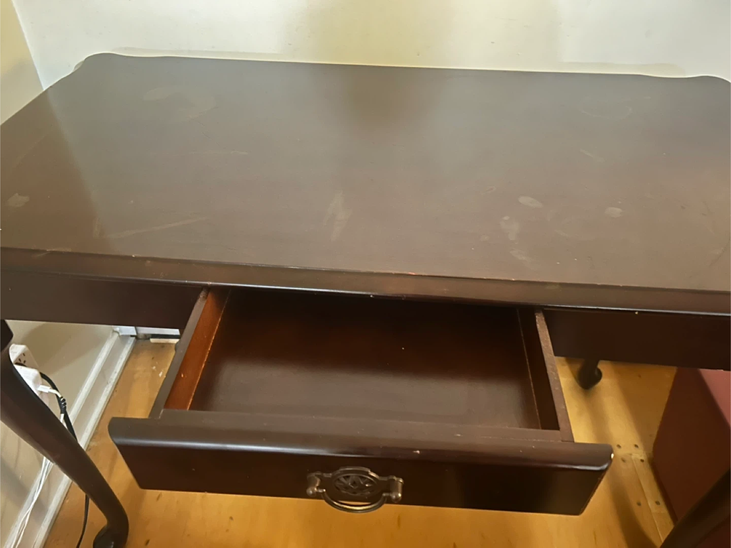 Selling a dark brown antique desk. It has a drawer and cabriole legs. There are some signs of wear on the top surface and edges, as shown in the photos 4 and 5.