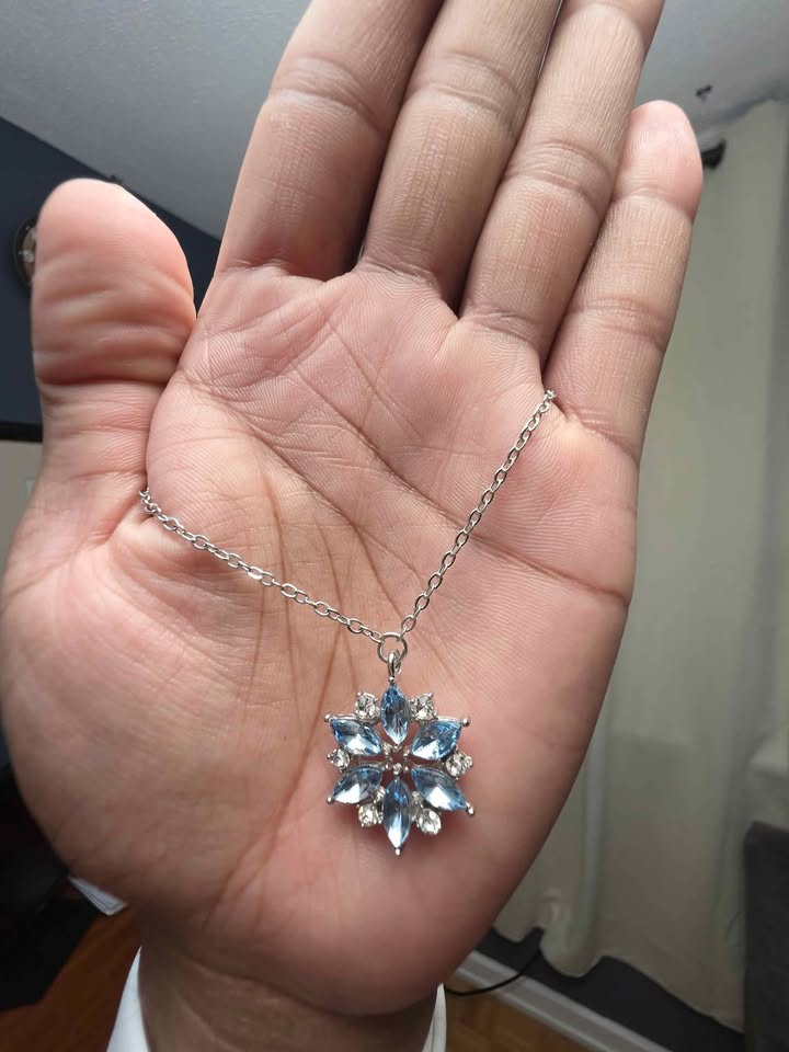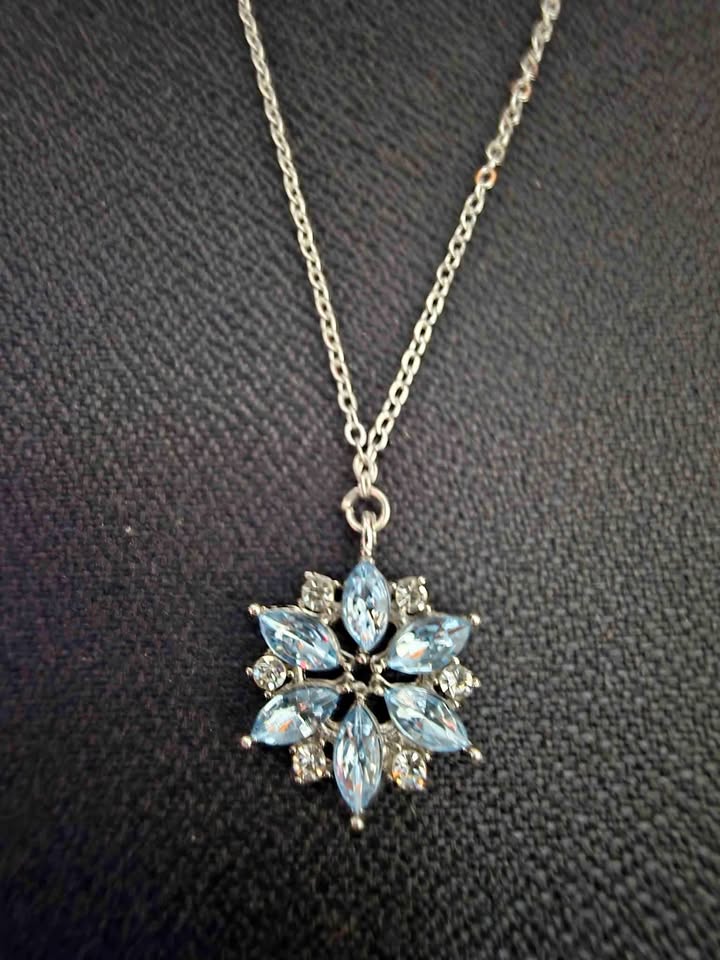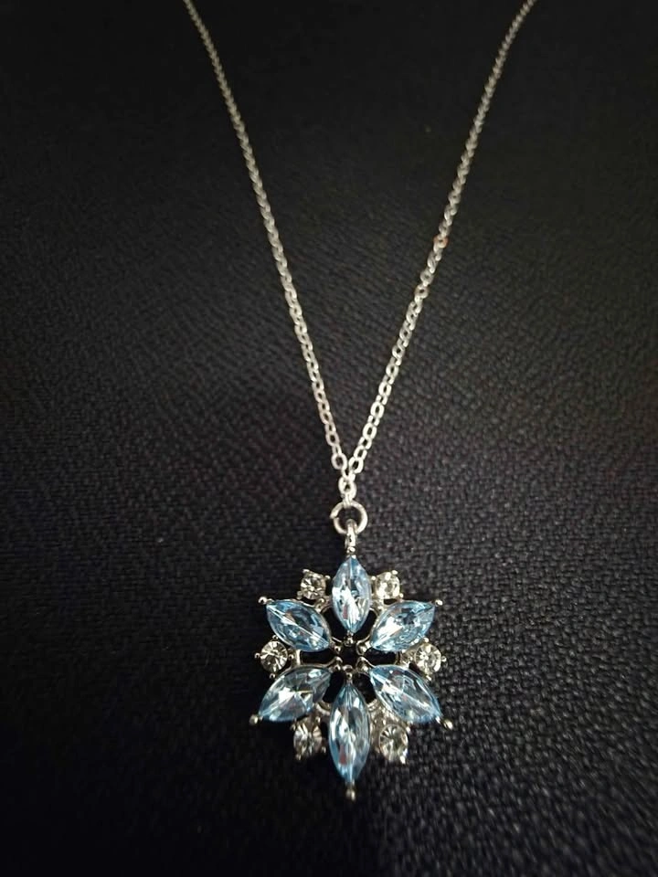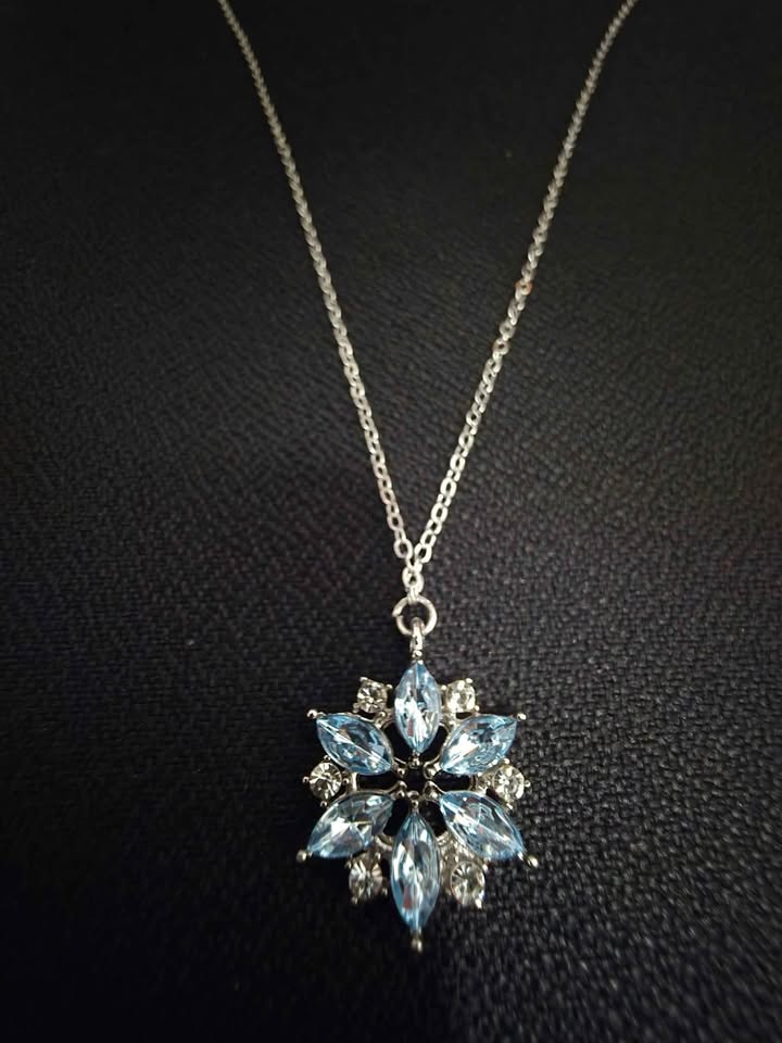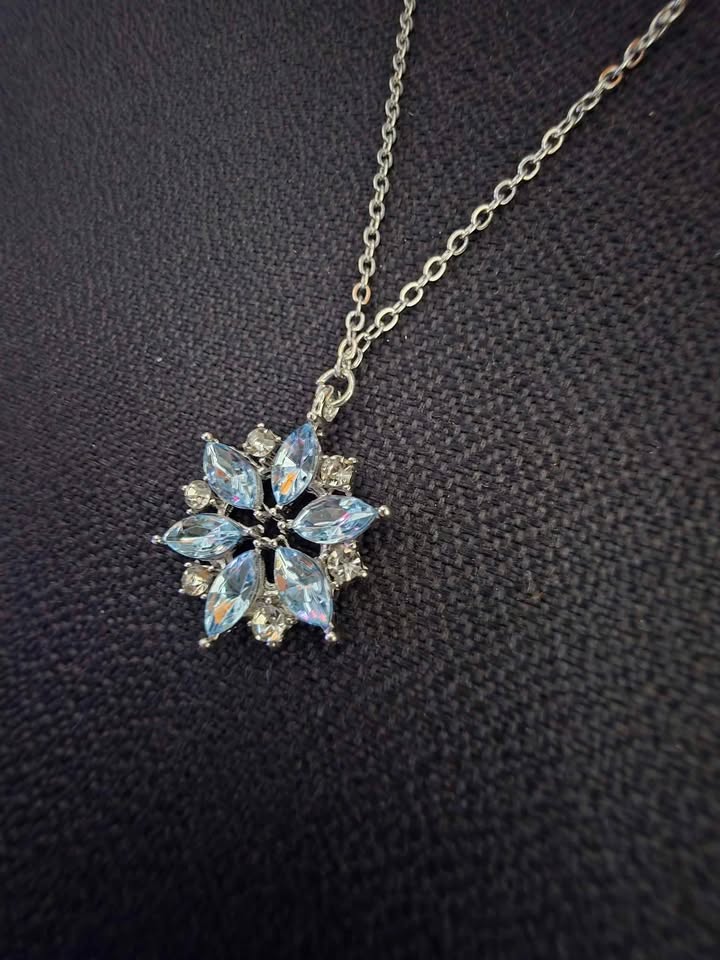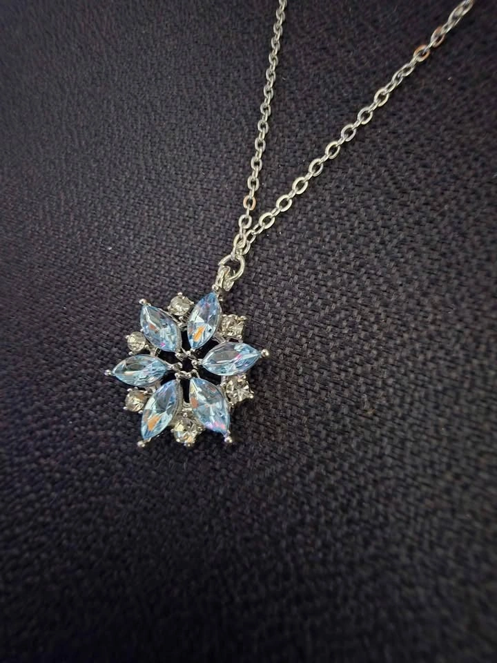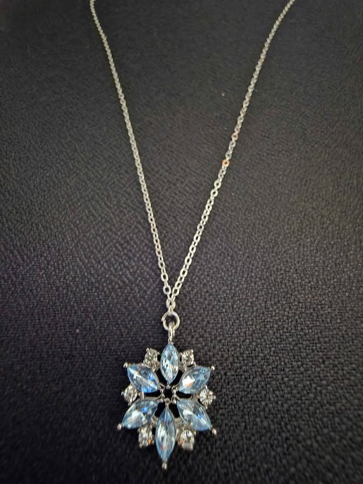 Add a touch of elegance to your style with this snowflake-inspired pendant necklace. It features light-blue marquise-cut crystals arranged in a floral-snowflake pattern, accented by clear rhinestones.