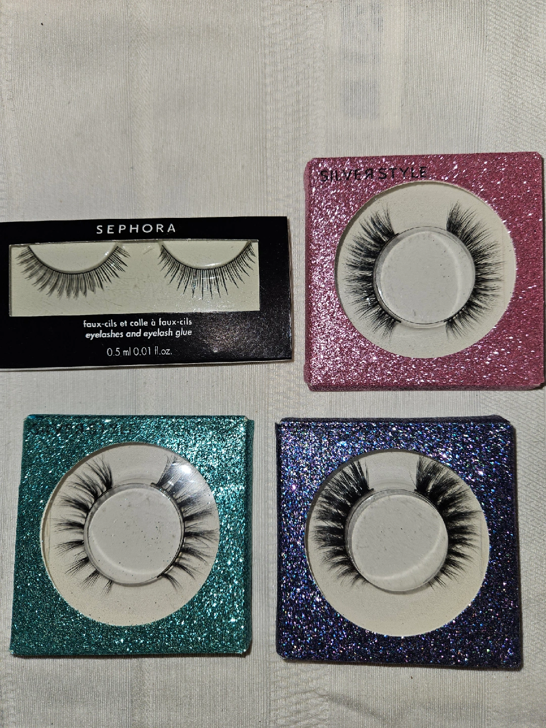 Selling Sephora faux-cils (eyelashes and eyelash glue) and Silver Style eyelashes, come in sparkly pink, teal, and blue cases