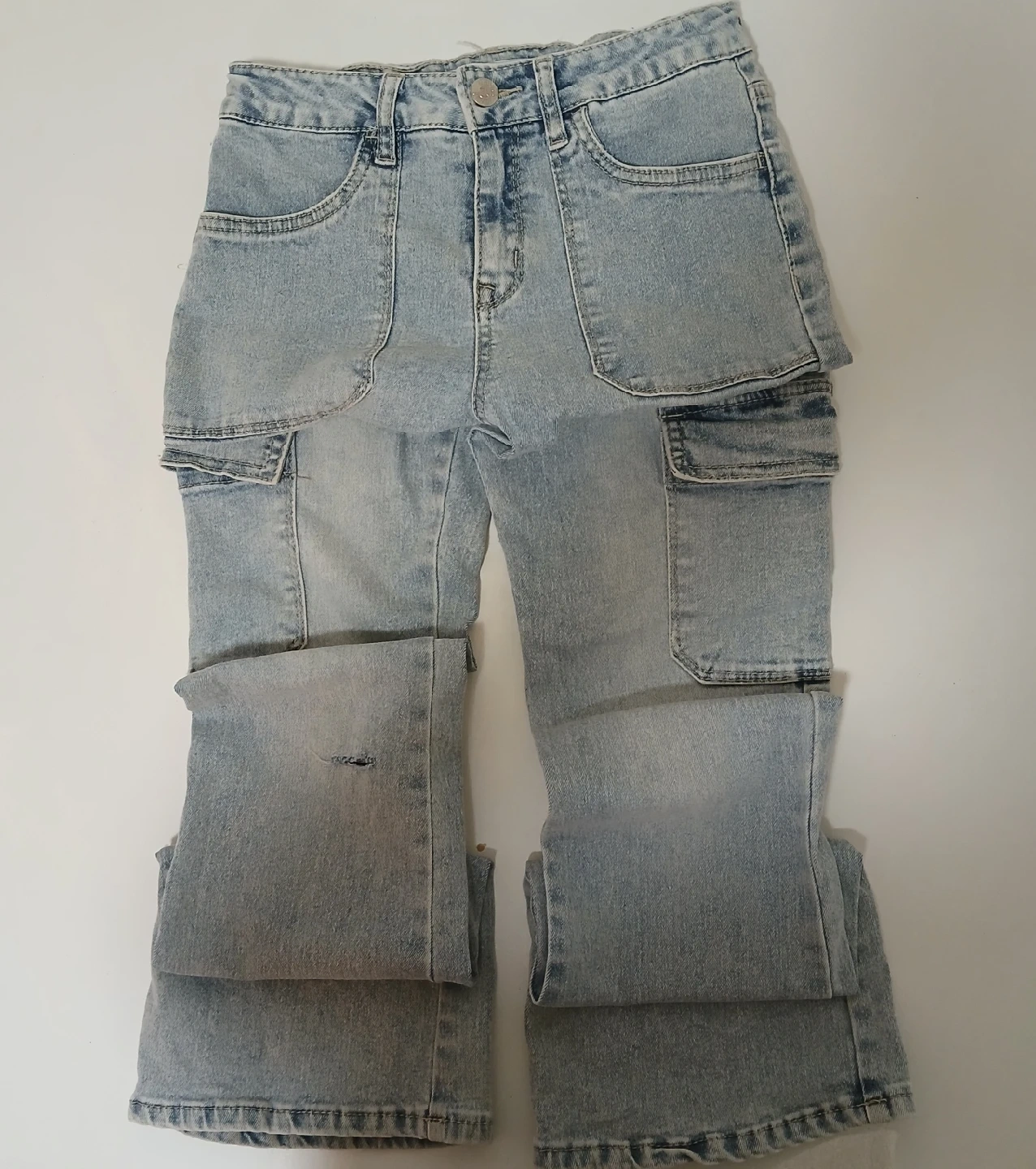 Selling a pair of light blue denim jeans. They have a unique design with cargo-style pockets. There is a small tear on one of the legs.