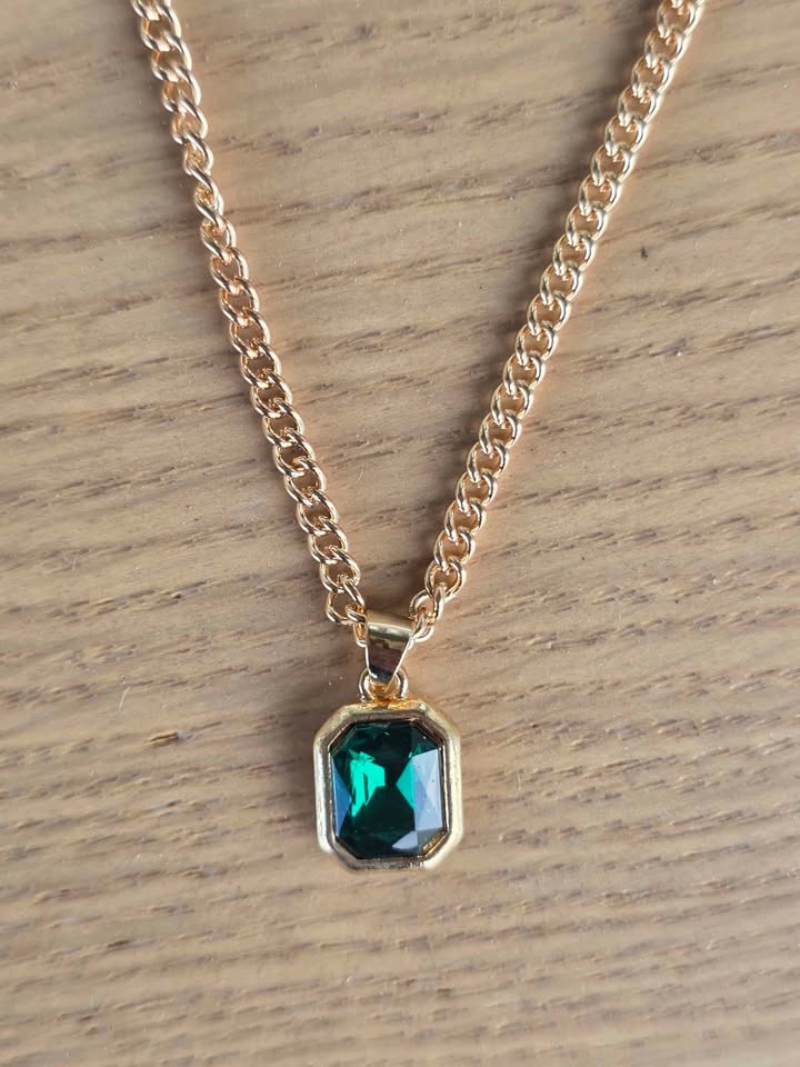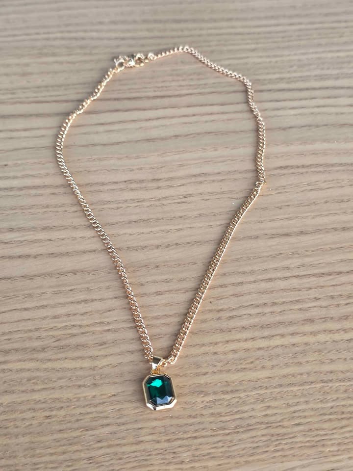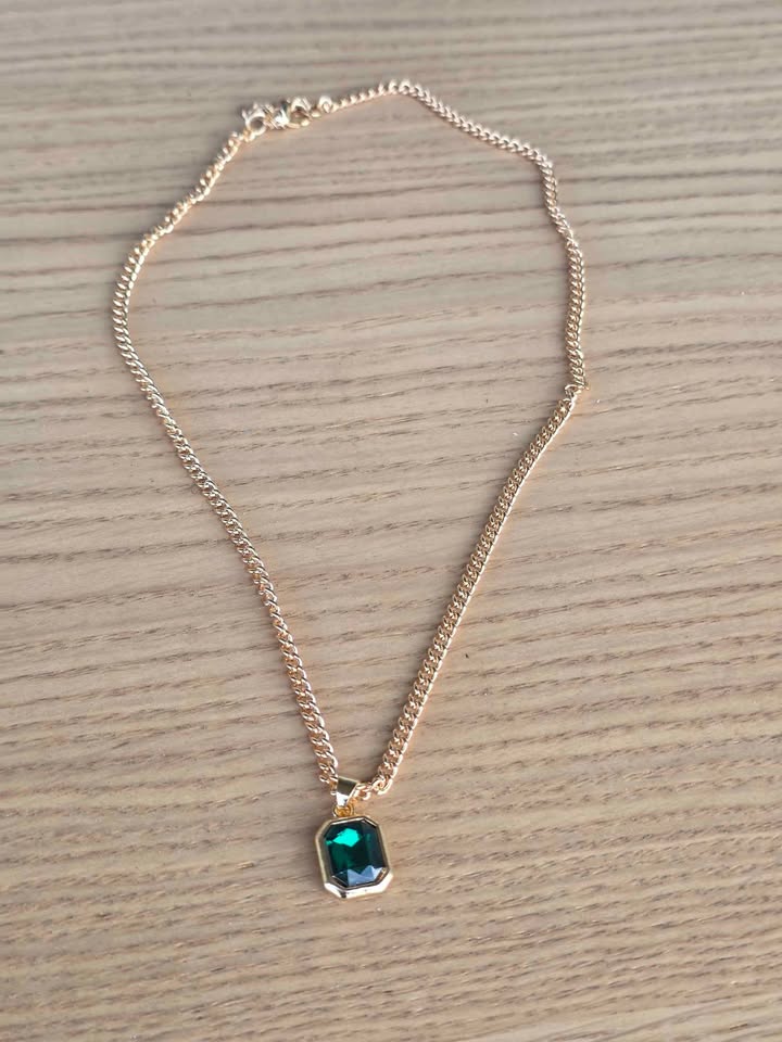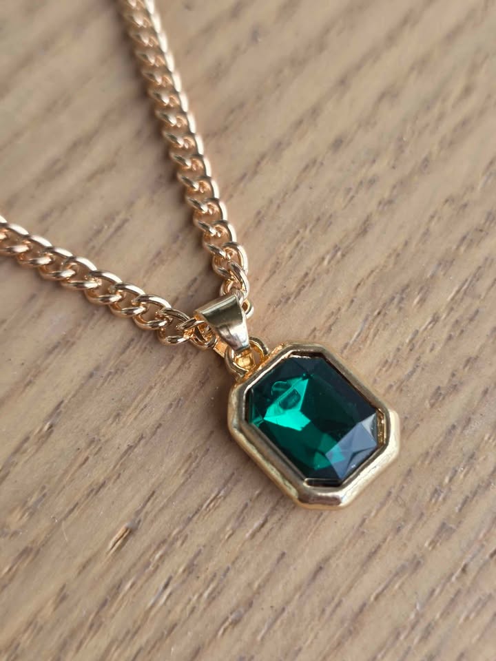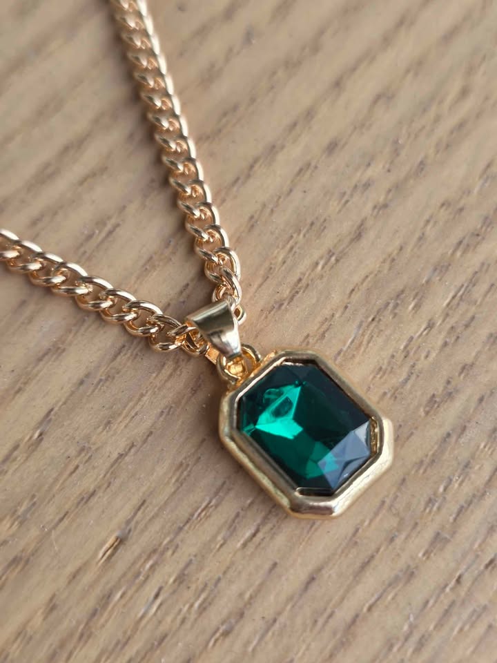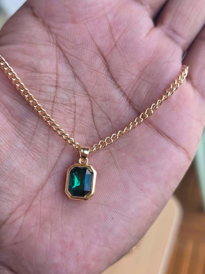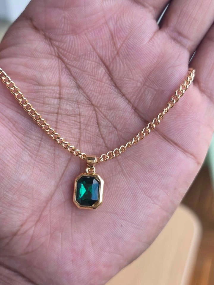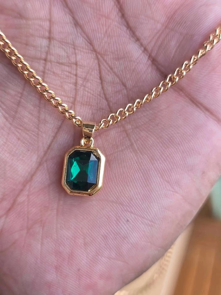 1pc Vintage Bohemian Golden Stainless Steel Chain Necklace featuring a stunning square-cut green gemstone pendant.