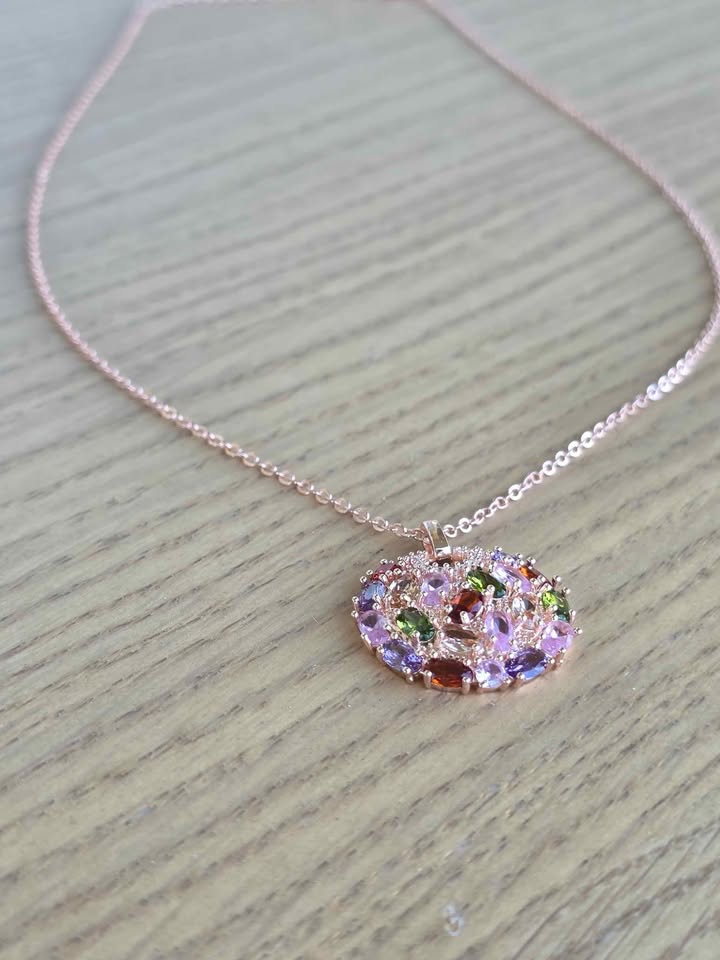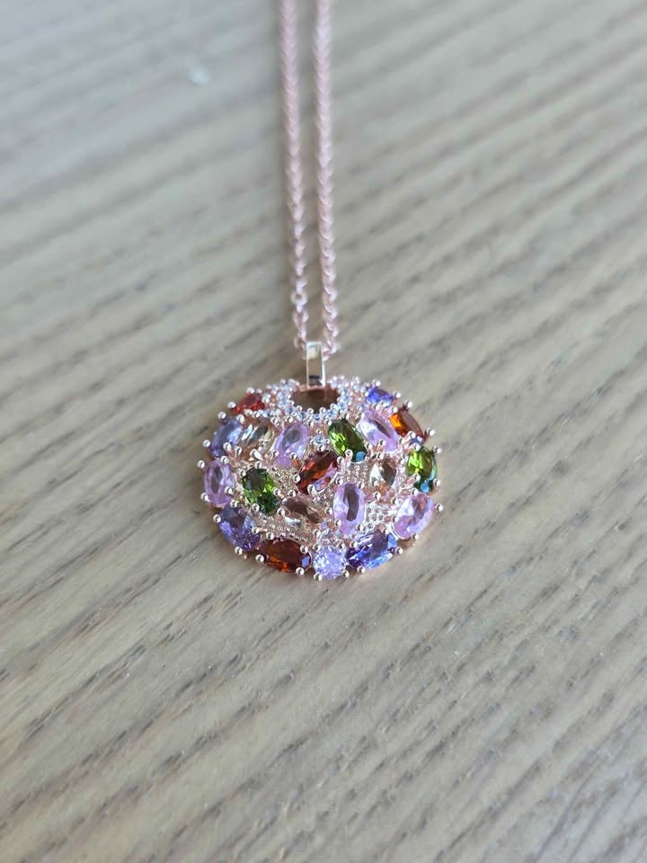 Elegant and eye-catching, this beautiful necklace features a rose-gold finish on a copper chain with a sparkling round pendant set with multicolor cubic zirconia stones.