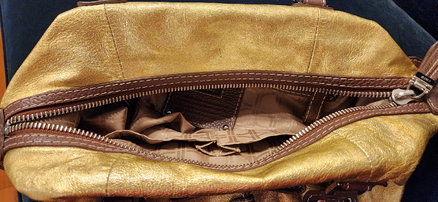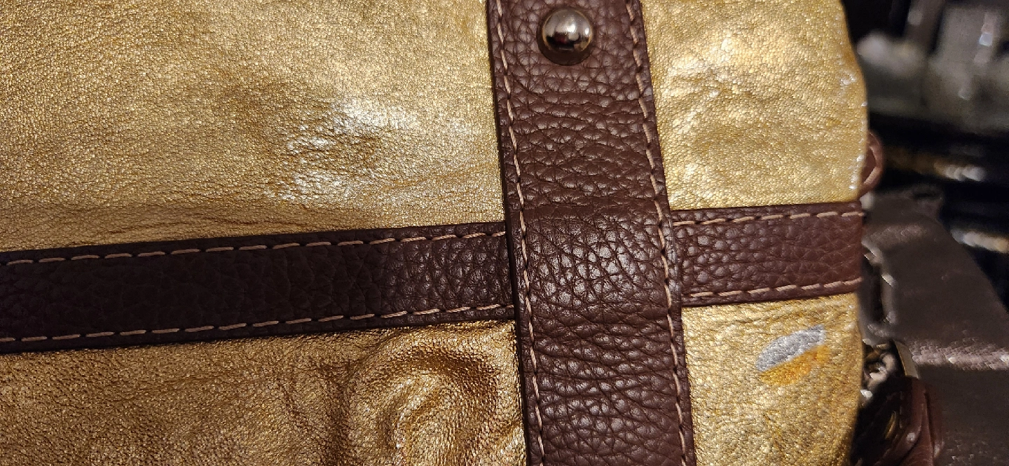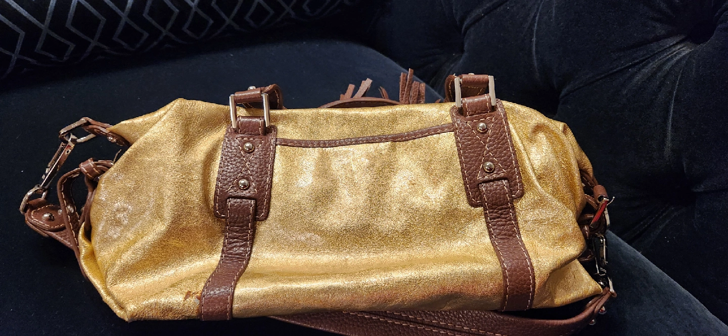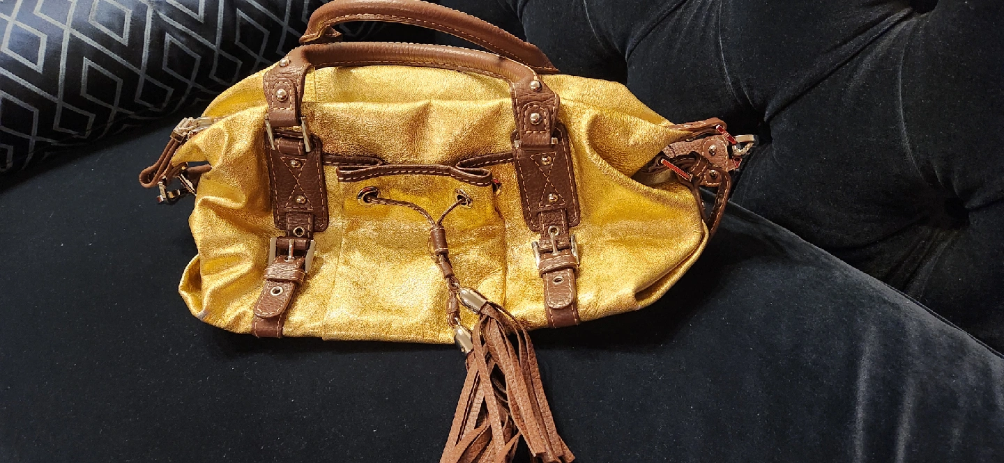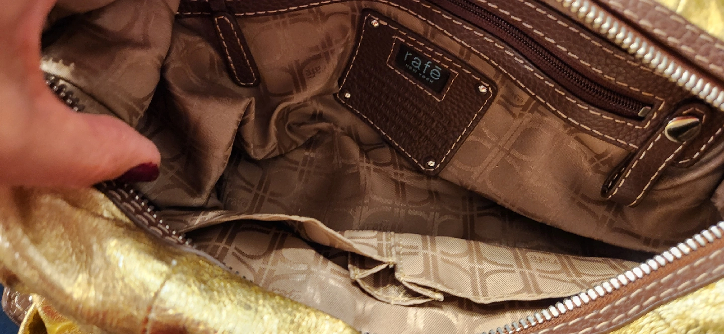 This is a beautiful gold leather satchel from Rafe New York. It is in good condition with some signs of wear as shown in the photos. This stylish bag is perfect for adding a touch of glam to any outfit!