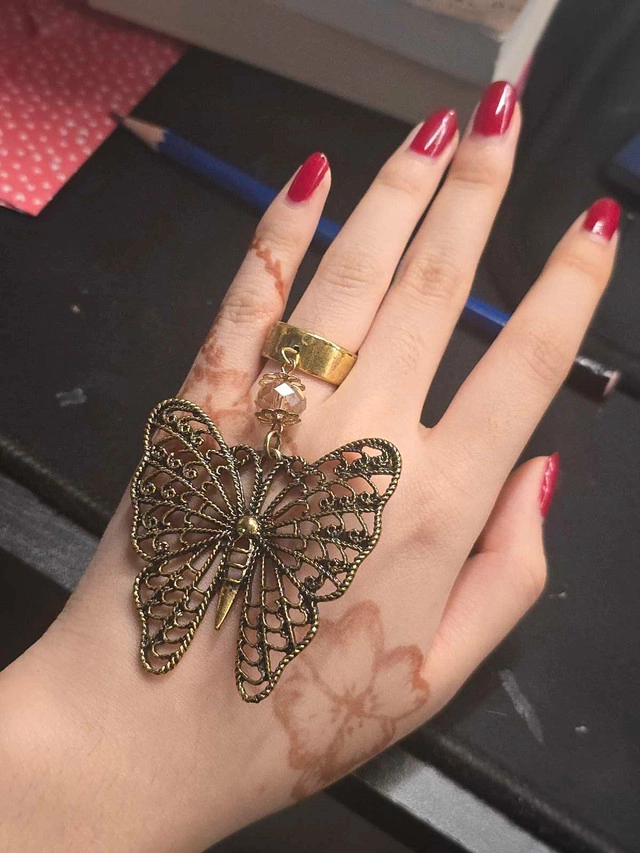 This unique and eye-catching butterfly ring features an intricate filigree design with a decorative bead, perfect for adding a whimsical touch to any outfit. This is a used item. If the ad is up, it's available!
