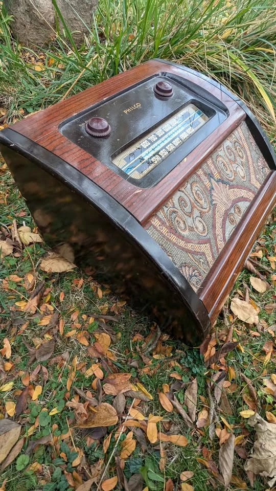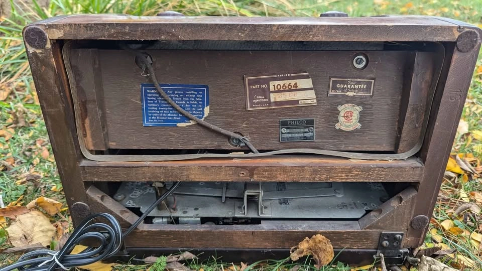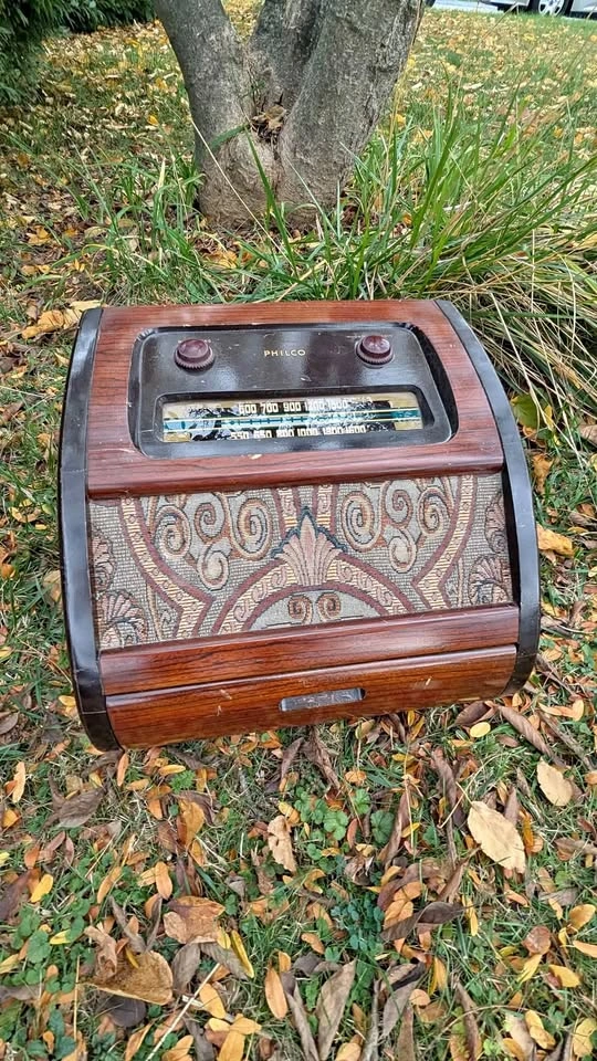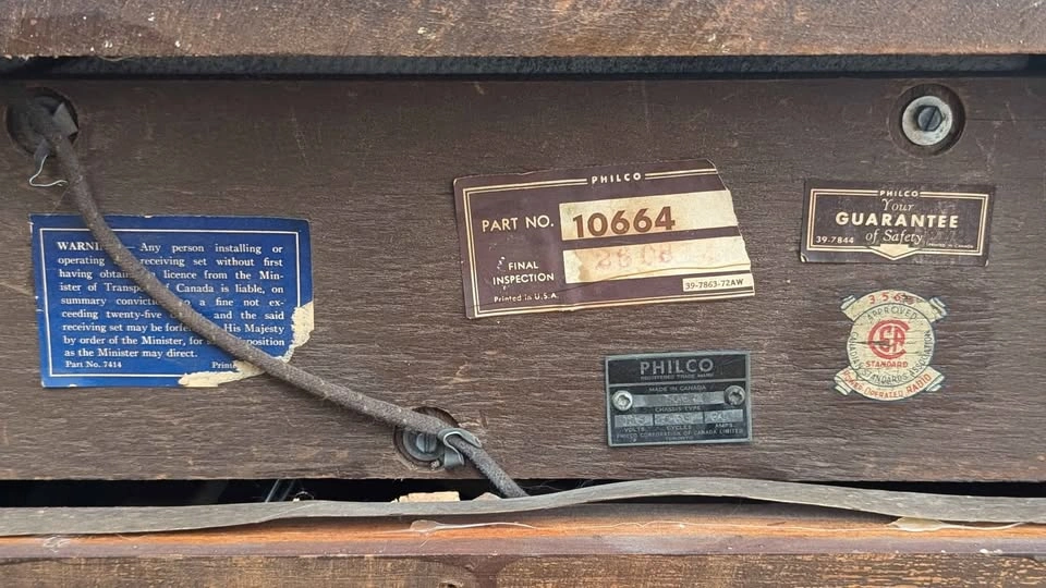Beautiful pre-war Philco radio and record player console, made by Philco Corporation of Canada Ltd. in Toronto. This unit features a walnut curved cabinet, fabric grille with art deco design, and a dual-tone amber dial.