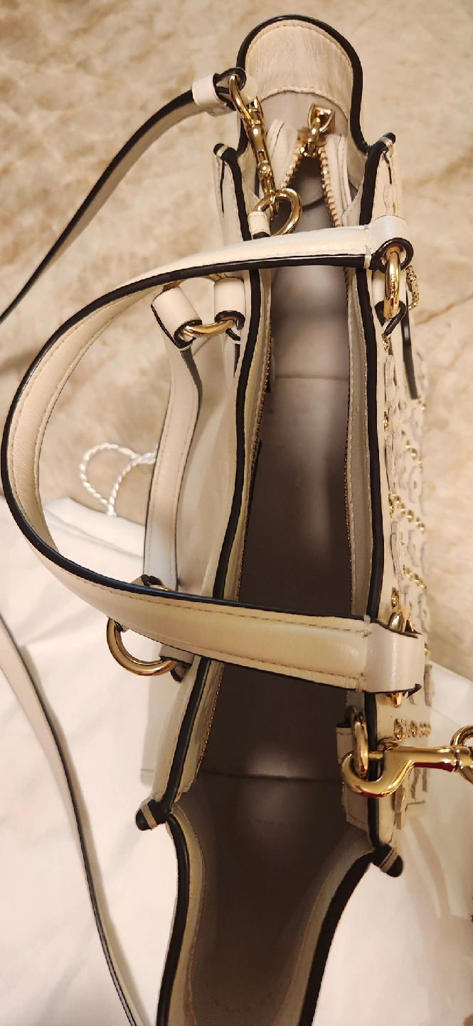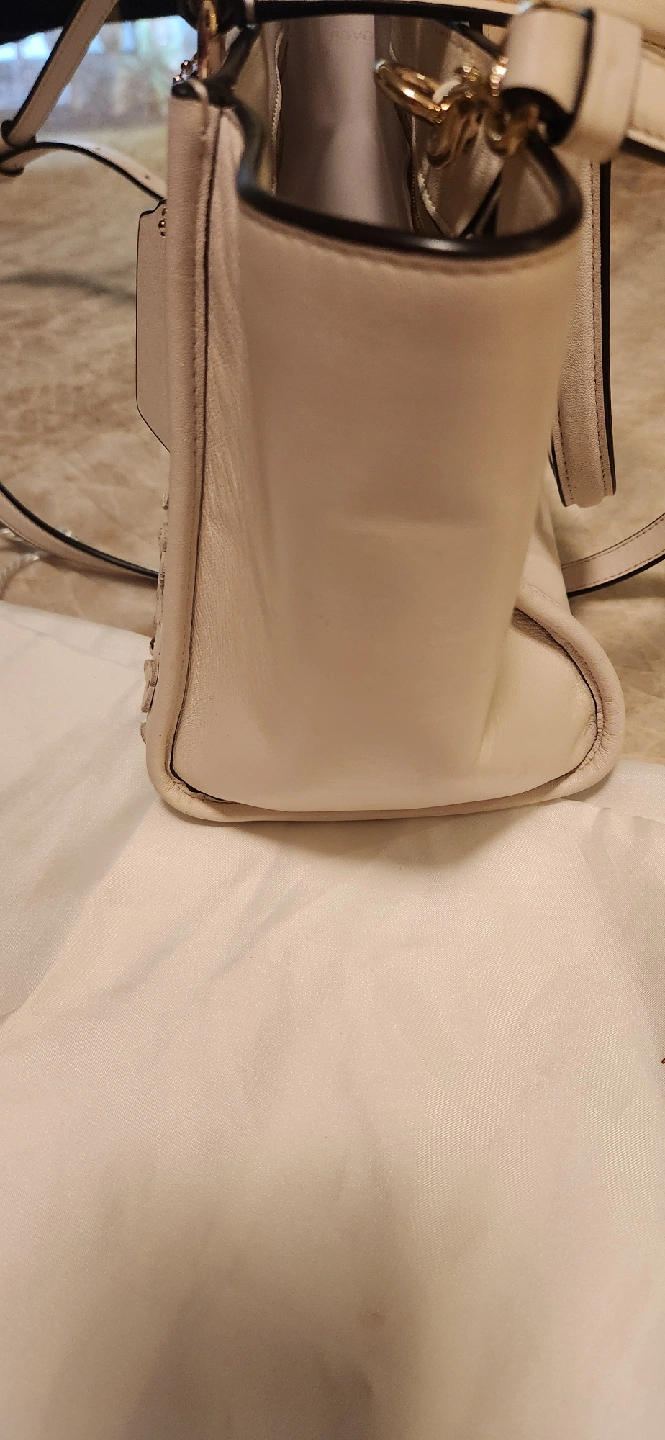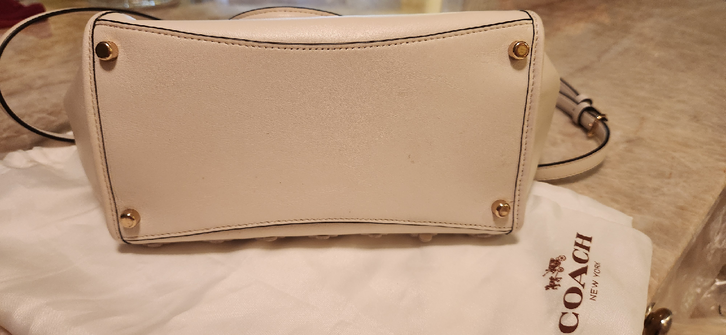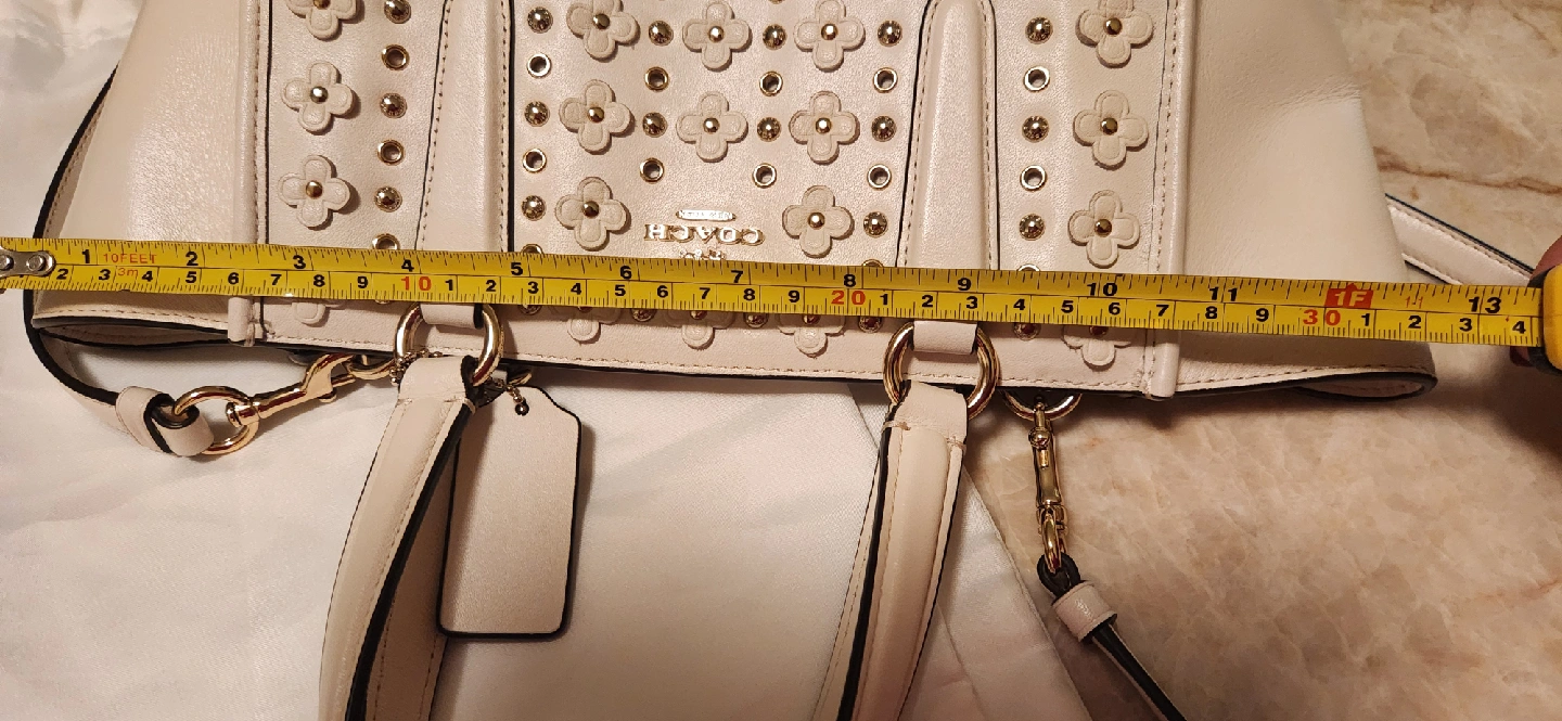 Selling a Coach satchel in a lovely off-white colour with floral rivet details. It's in great shape and measures approximately 10 inches across. Comes with its original dust bag! Lining has faint stains.