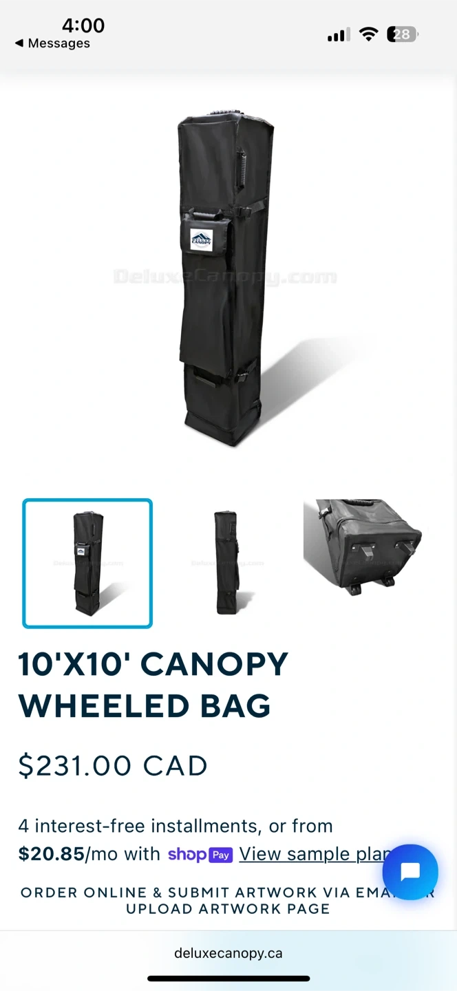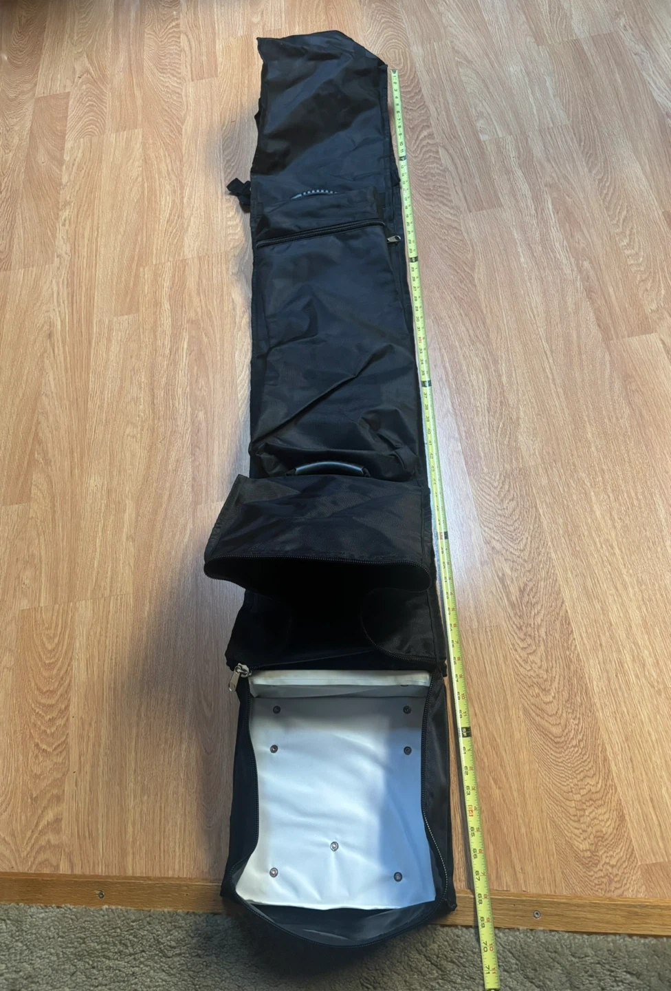 60Selling a 11” x 11” x 5’ wheeled bag in black. It's in new condition and ready to go! Originally bought for $231.00 CAD Great for transporting folding canopies, snow skis etc. with heavily reinforced wheeled base. Compare at twice the price.