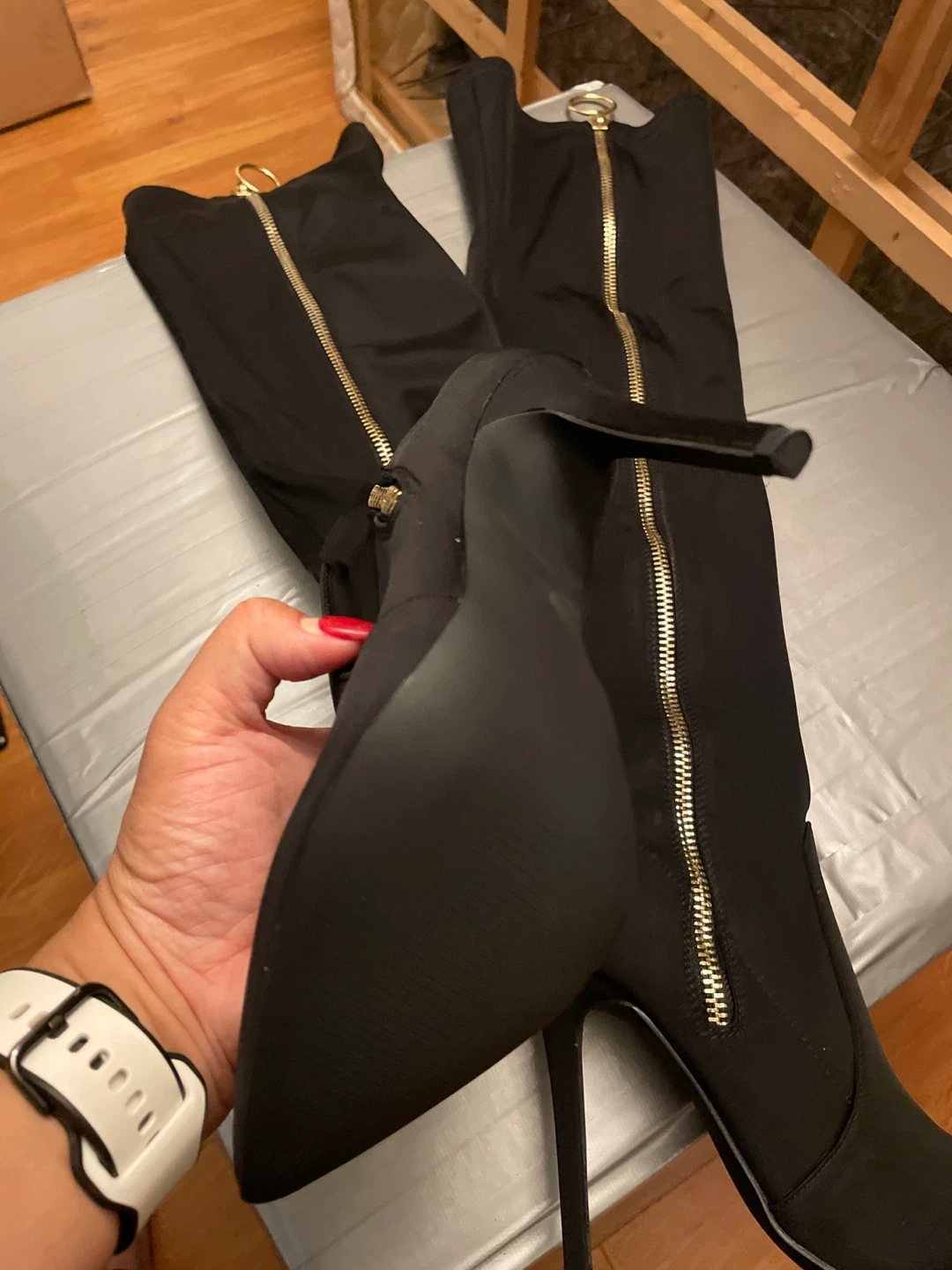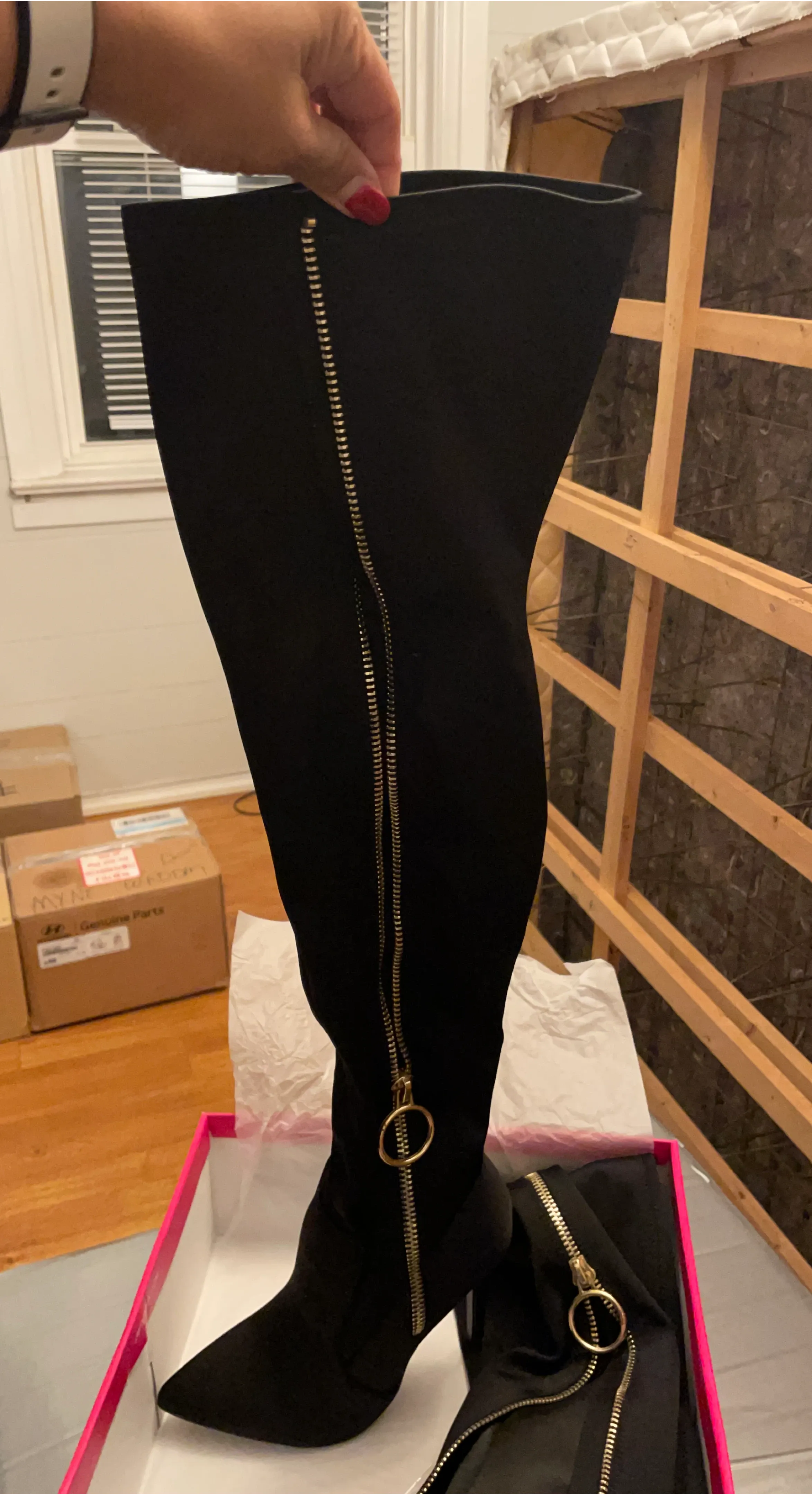 Selling a pair of black thigh-high boots with a zipper detail! They're in great condition and would be a stylish addition to any wardrobe. Never used!