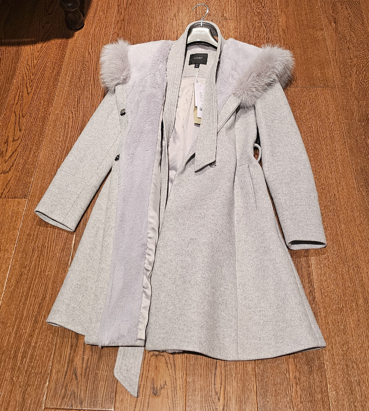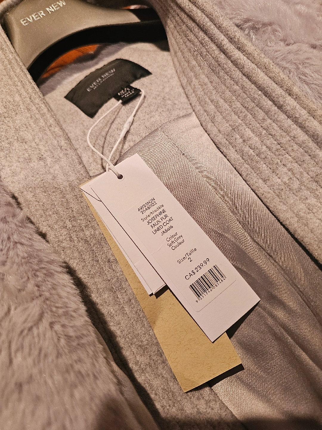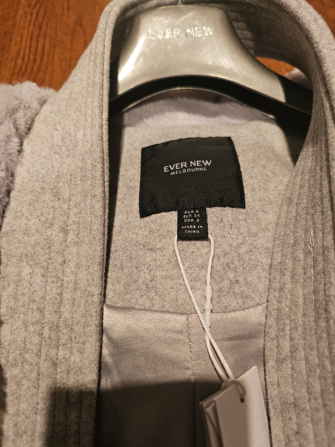 Selling an Ever New coat in a soft grey colour. It's lined with faux fur and is a size 2. Retails for $239.99!