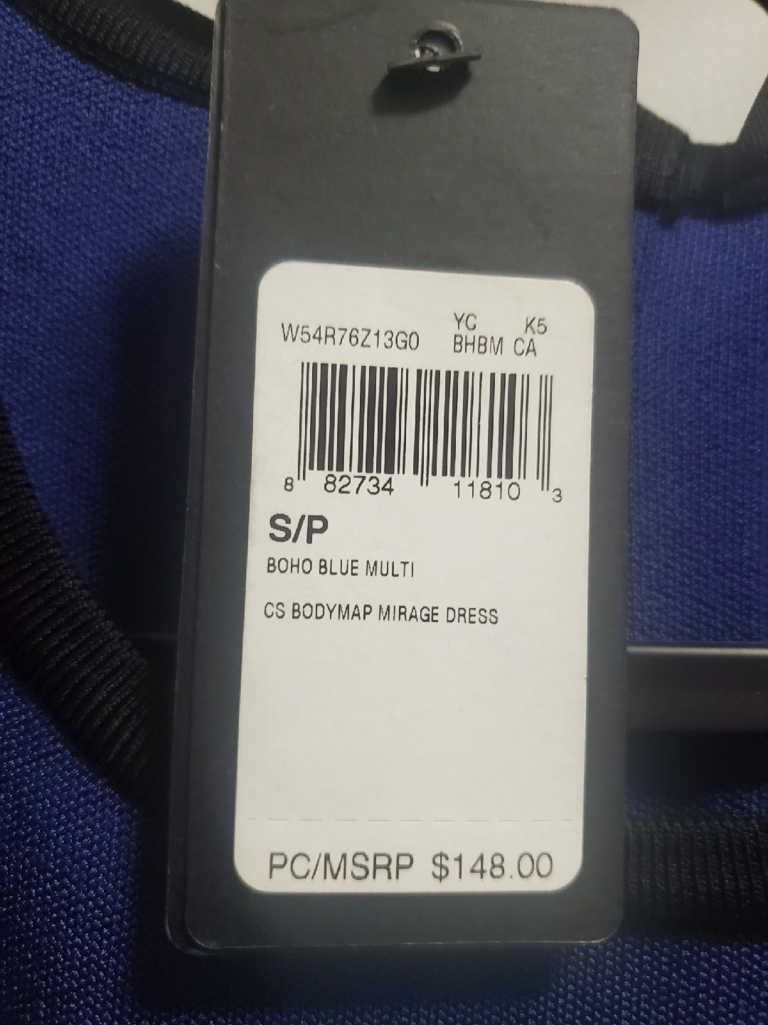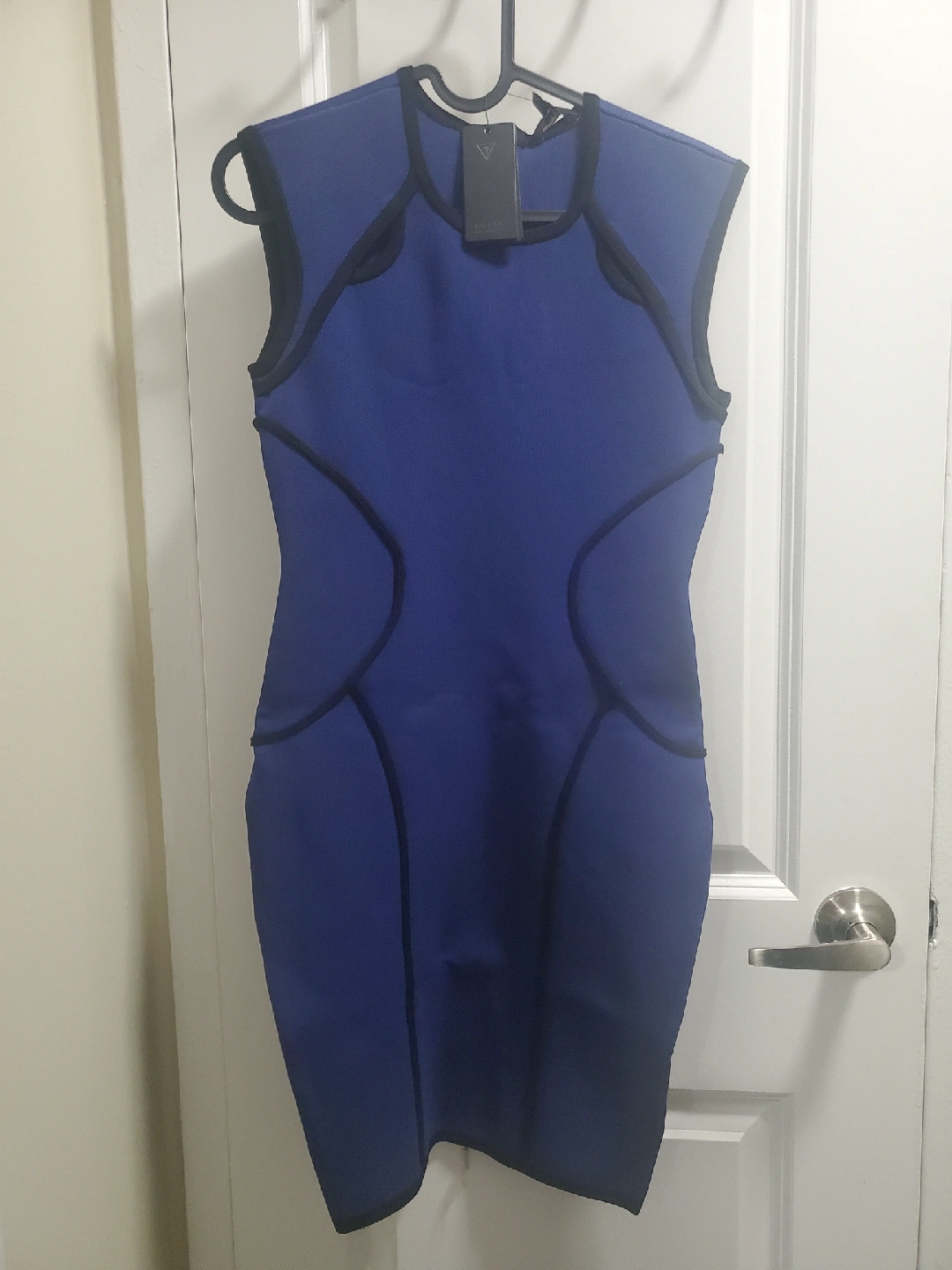 22Guess Boho Blue Multi bodycon dress in size small. The tag shows PC/MSRP $148.00 Smoke-free, pet-free Pick up only near Port Credit Go station in Mississauga