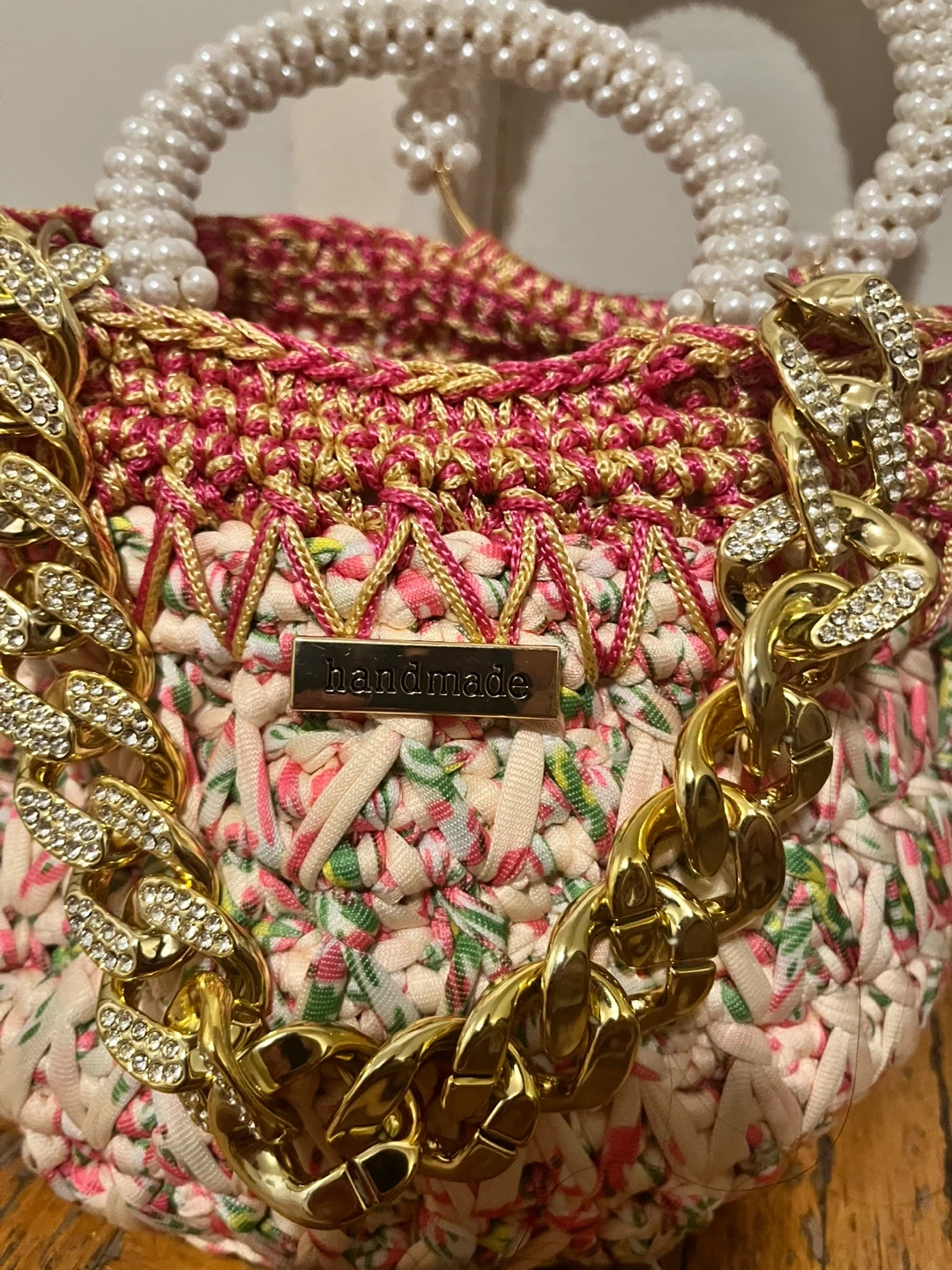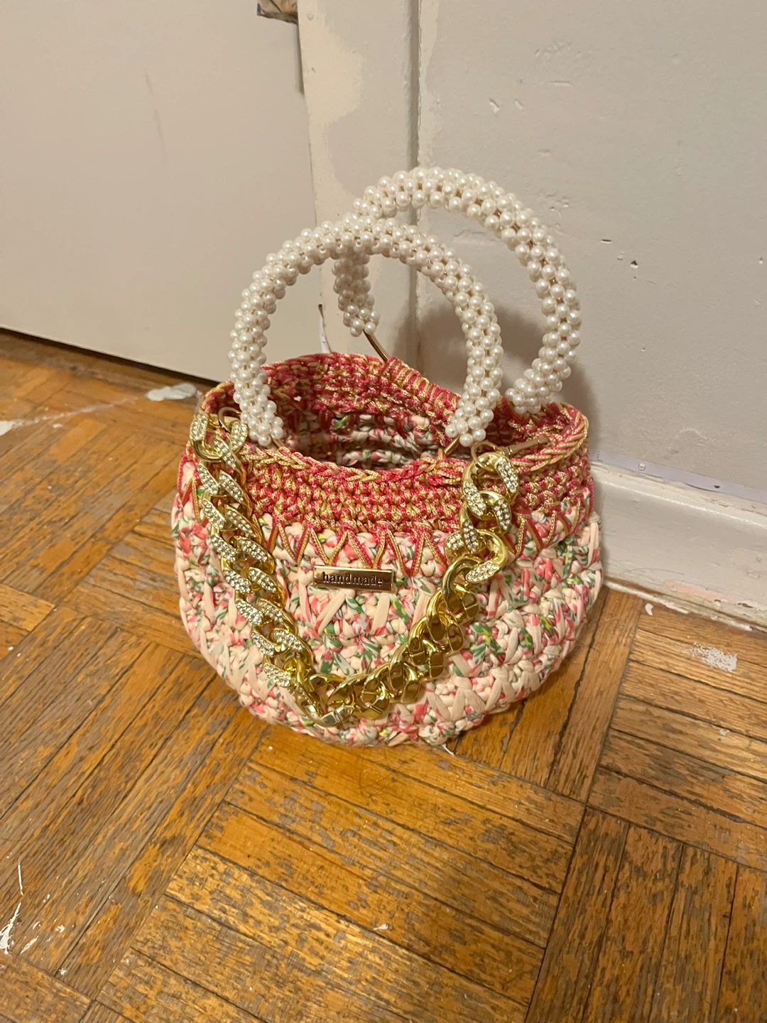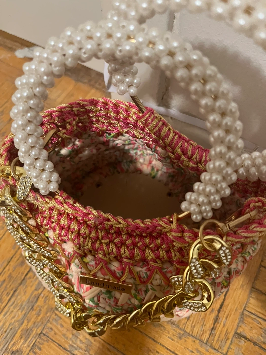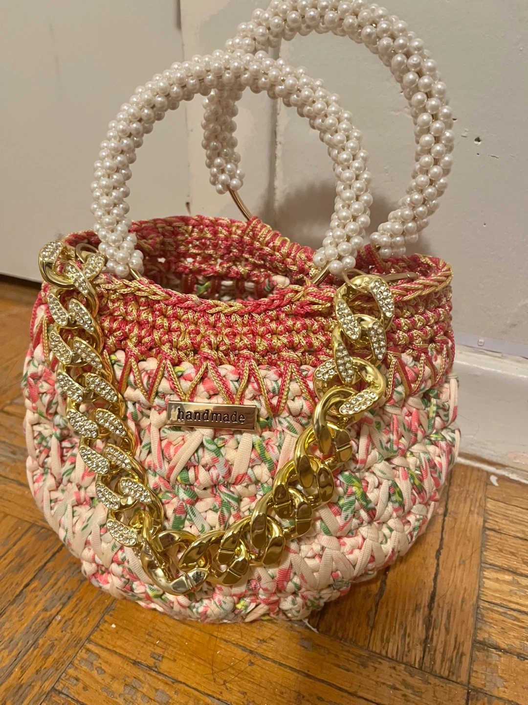 26Selling a unique handmade crochet purse! It features a lovely floral pattern with a pearl handle and a gold-tone chain accent. It's a real statement piece!