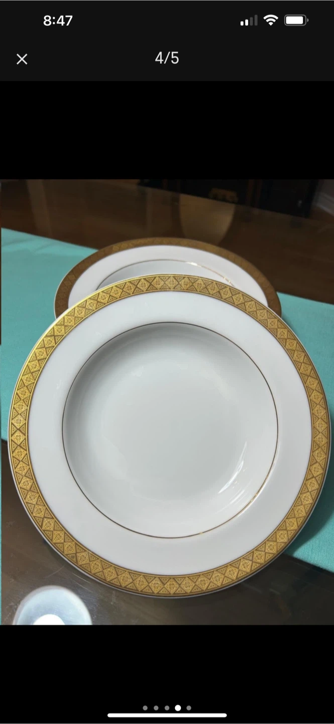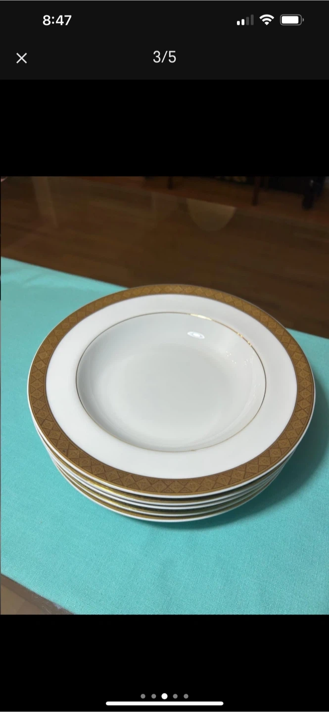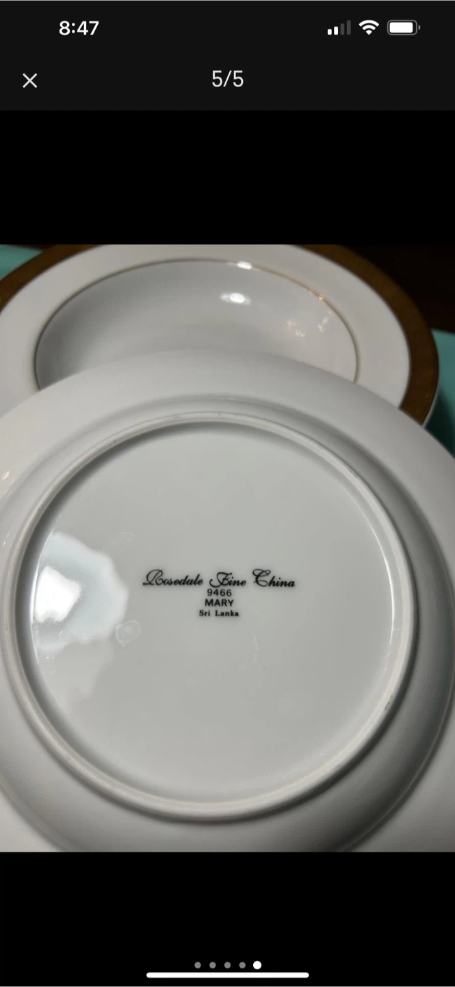 147Selling a set of 5 Rosedale Fine China soup bowls. They have a beautiful gold-patterned rim and are in great condition. Perfect for adding a touch of elegance to your dining table!