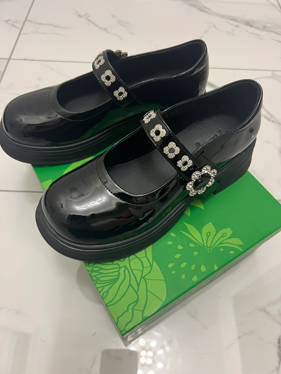 83Selling a pair of adorable girls' black patent leather shoes in size 35, These shoes feature a cute strap with flower embellishments. They come with the original box!
