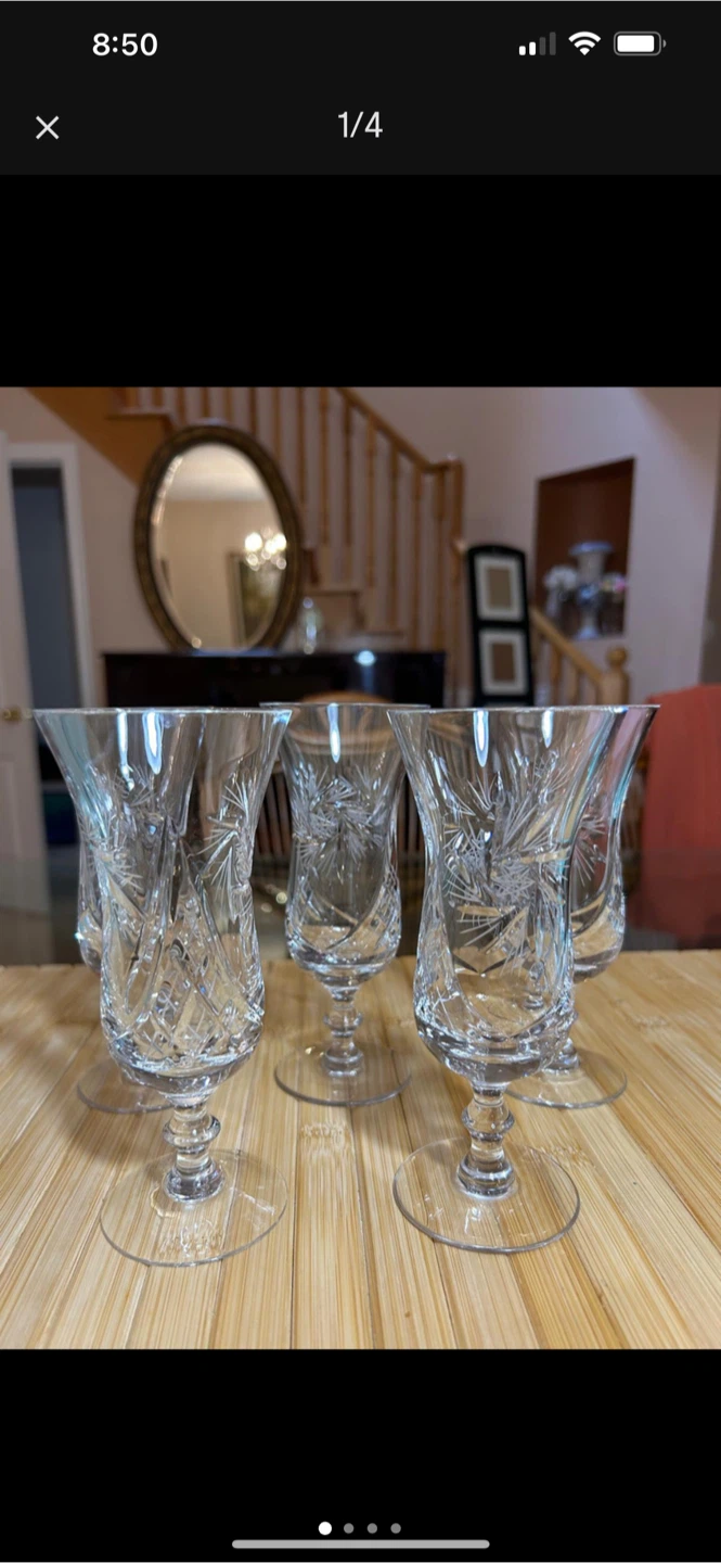 Selling a set of 5 beautiful crystal cordial glasses. They feature a delicate starburst pattern and are perfect for serving after-dinner drinks or adding a touch of elegance to your table. These glasses are in great condition and ready to be enjoyed!