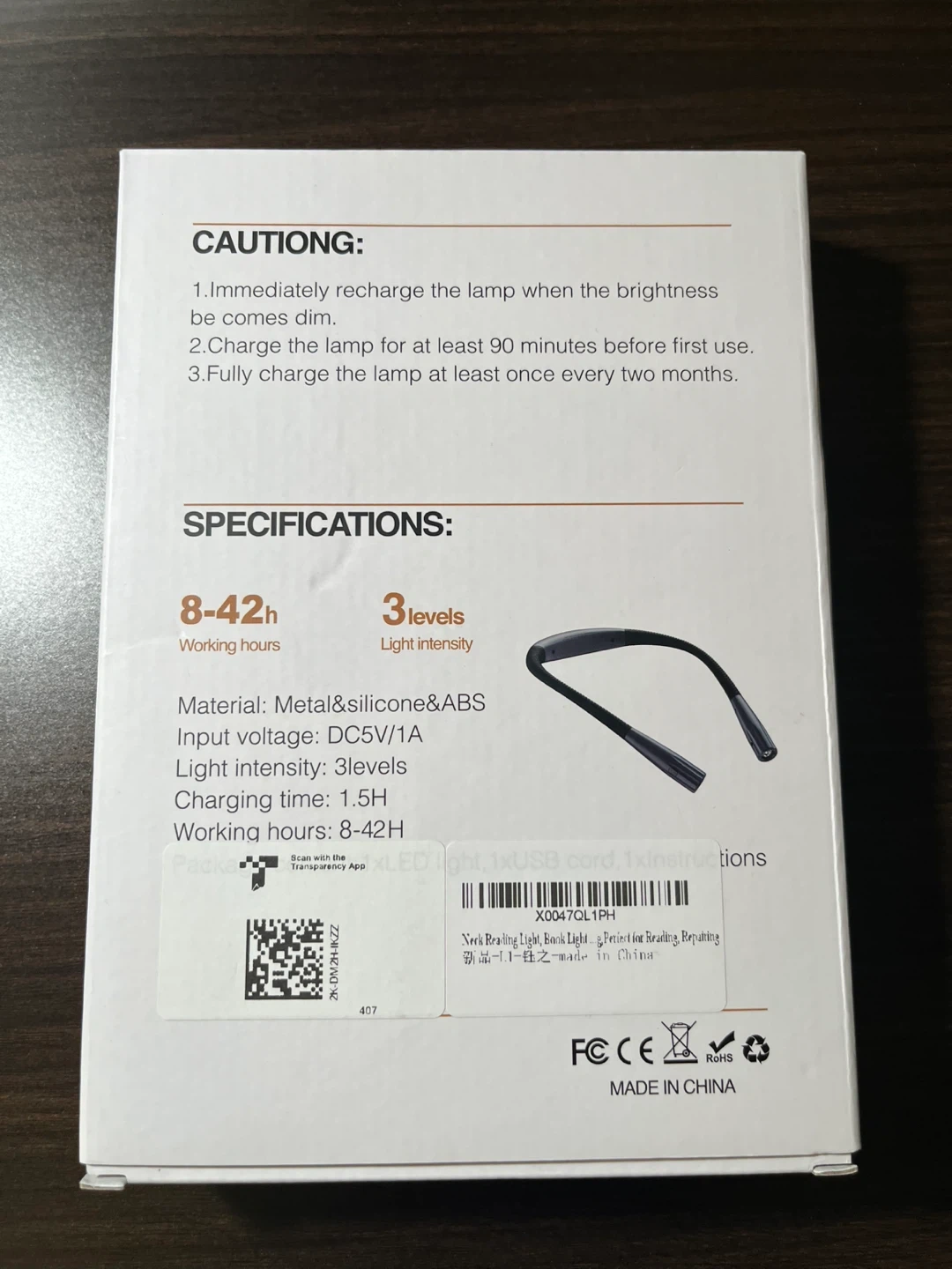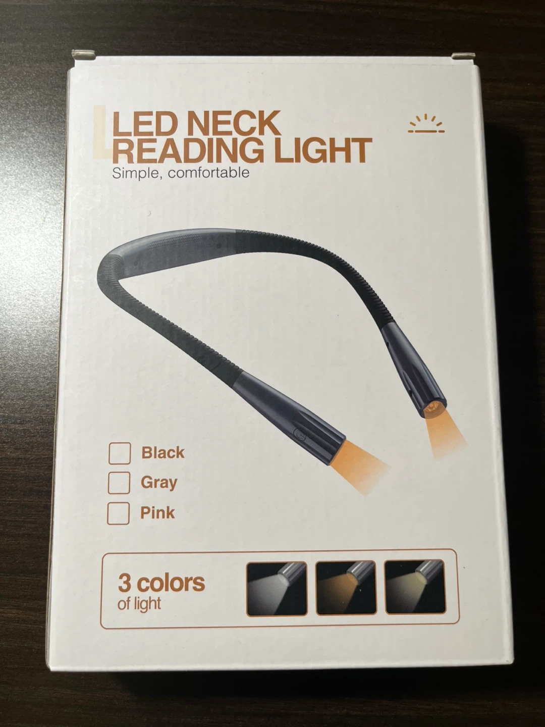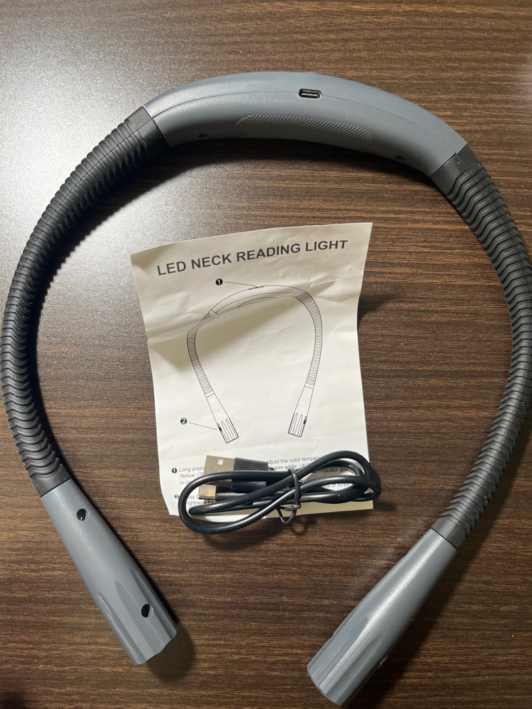 18Selling a handy LED neck reading light! It's perfect for reading in bed or anywhere you need a little extra light. It features adjustable brightness with 3 levels of light intensity and can last for 8-42 hours on a single charge. The light is gray and comes with a USB cord and instructions. Made with metal, silicone, and ABS materials