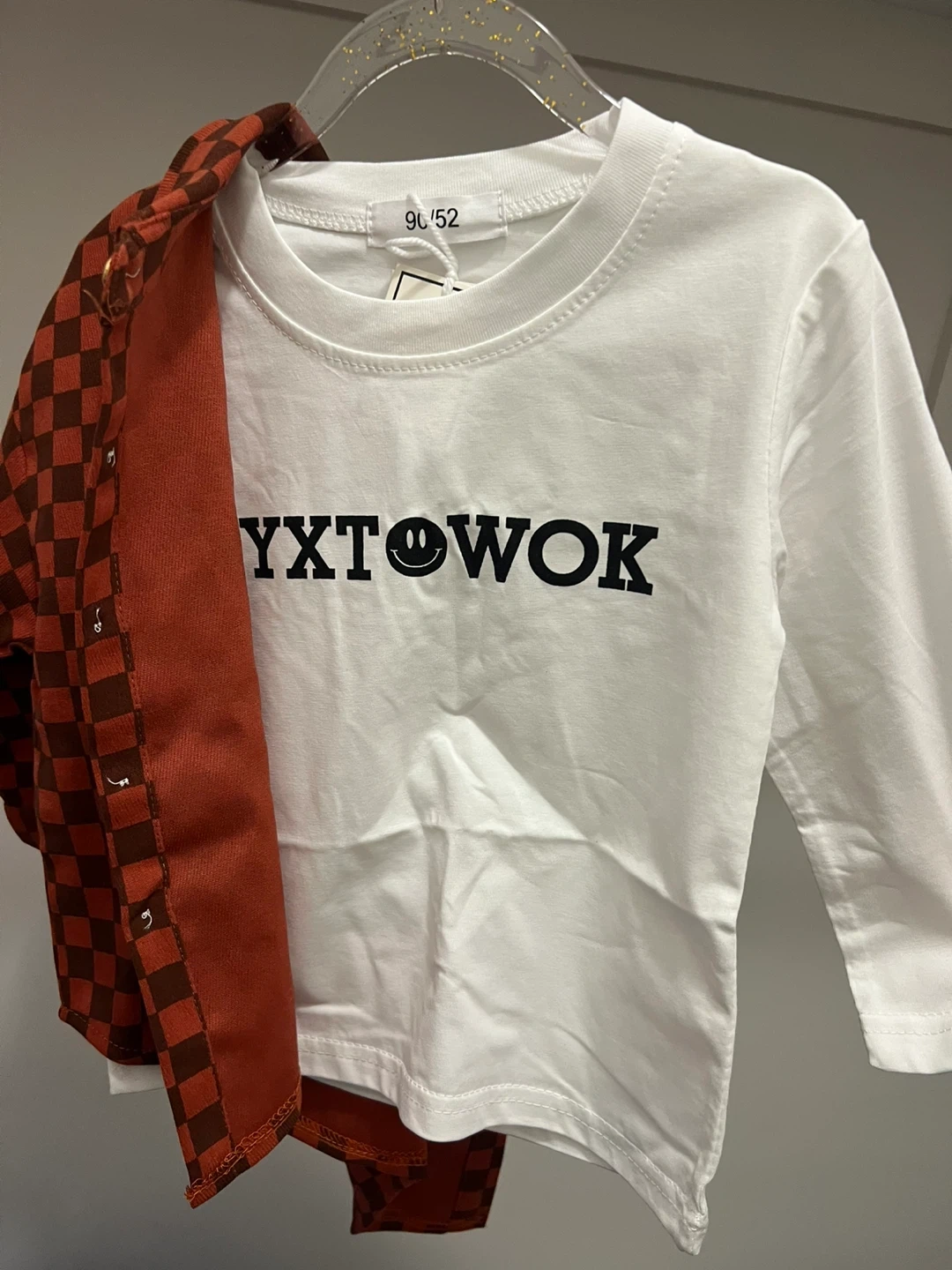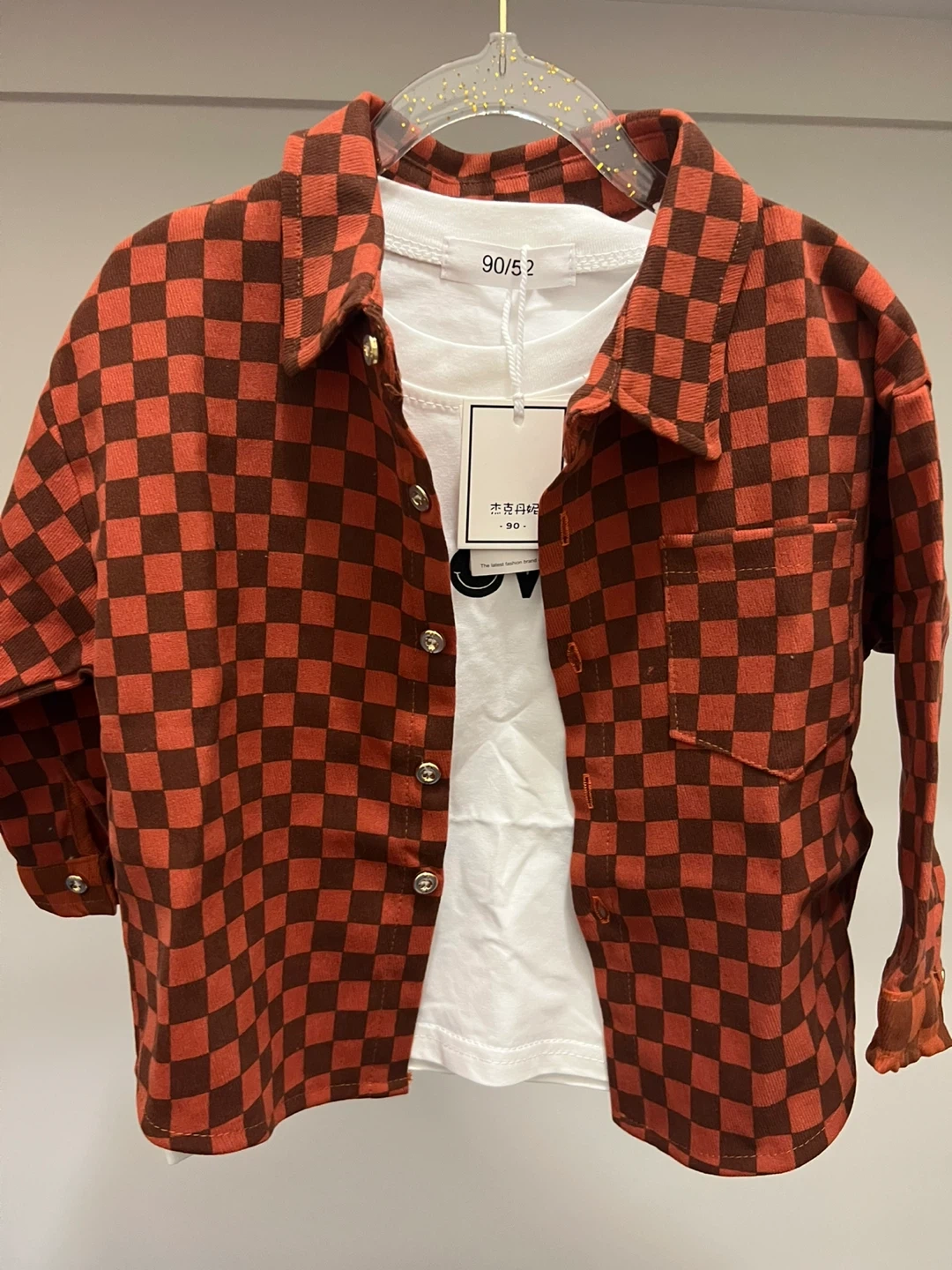 83A cute set for your little one! This includes a checkered button-up shirt in brown and orange tones, paired with a white long-sleeve top. The size is marked as 90/52.