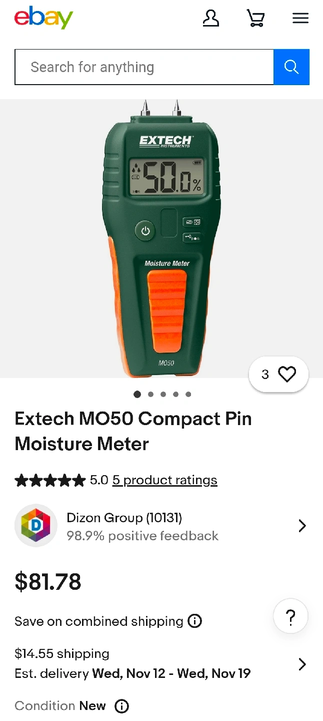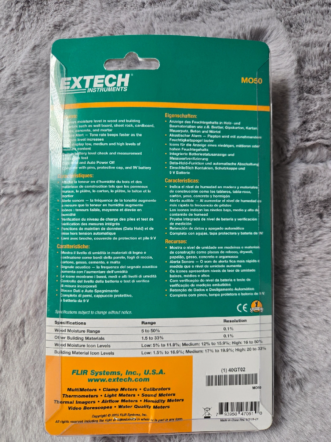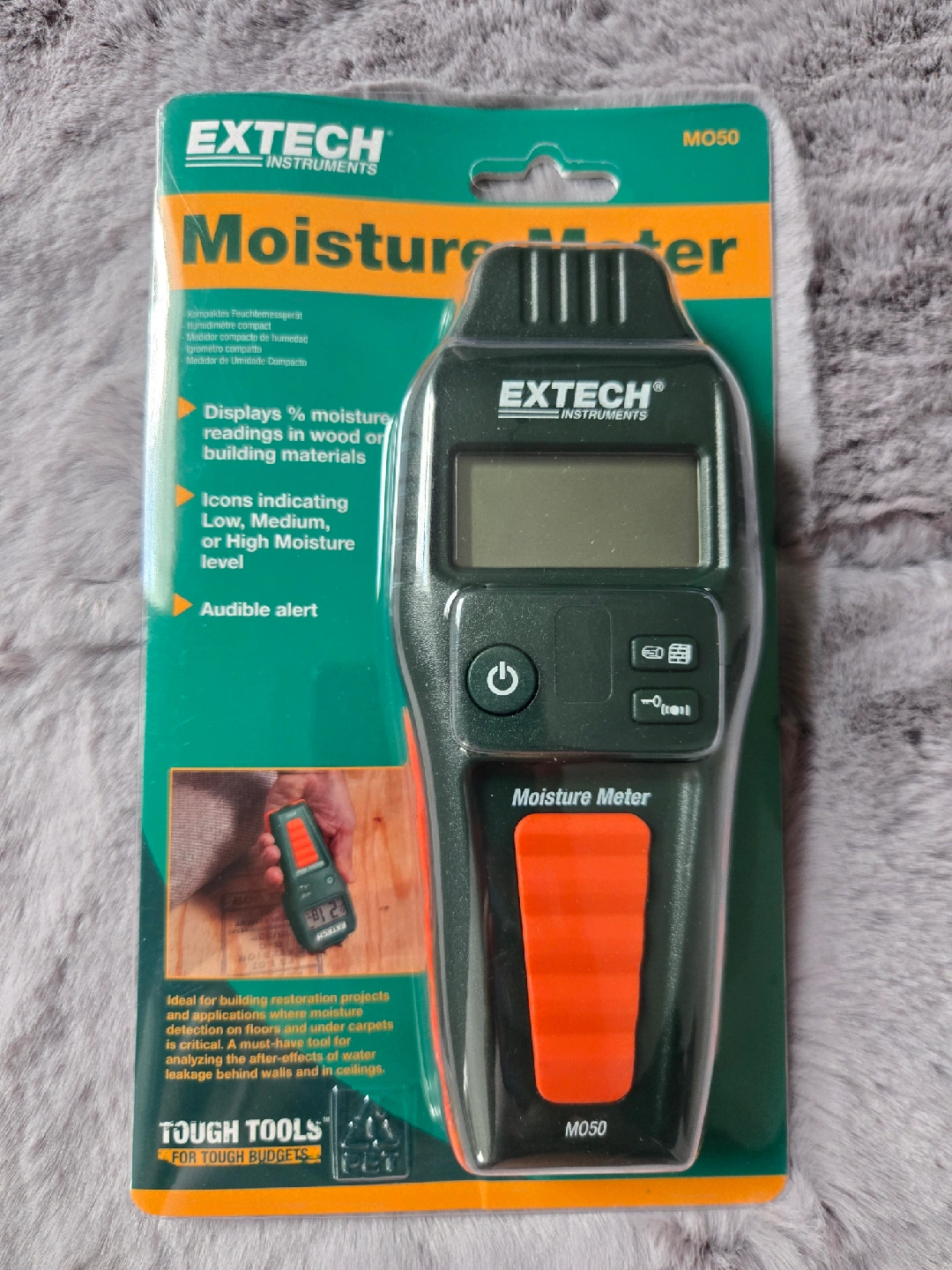 I'm selling a brand new Extech MO50 Compact Pin Moisture Meter! It displays moisture readings in wood or building materials, and has icons indicating low, medium, or high moisture levels. It also features an audible alert. Ideal for building restoration projects and applications where moisture detection behind walls and in ceilings is critical. A must-have tool for detecting moisture or water leakage behind walls and in ceilings. Originally bought for $81.78
