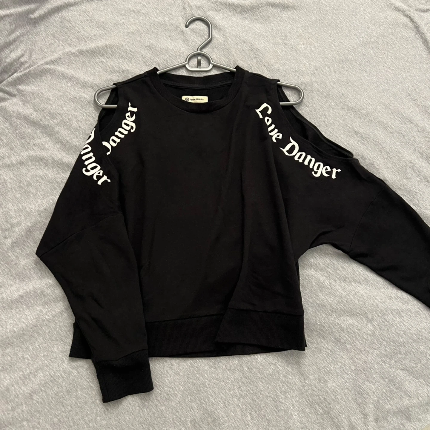 Trendy black sweater from C&A featuring stylish cut-out shoulders that show your arms and bold white “Love Danger” lettering on the sleeves. Perfect for a casual yet edgy look!