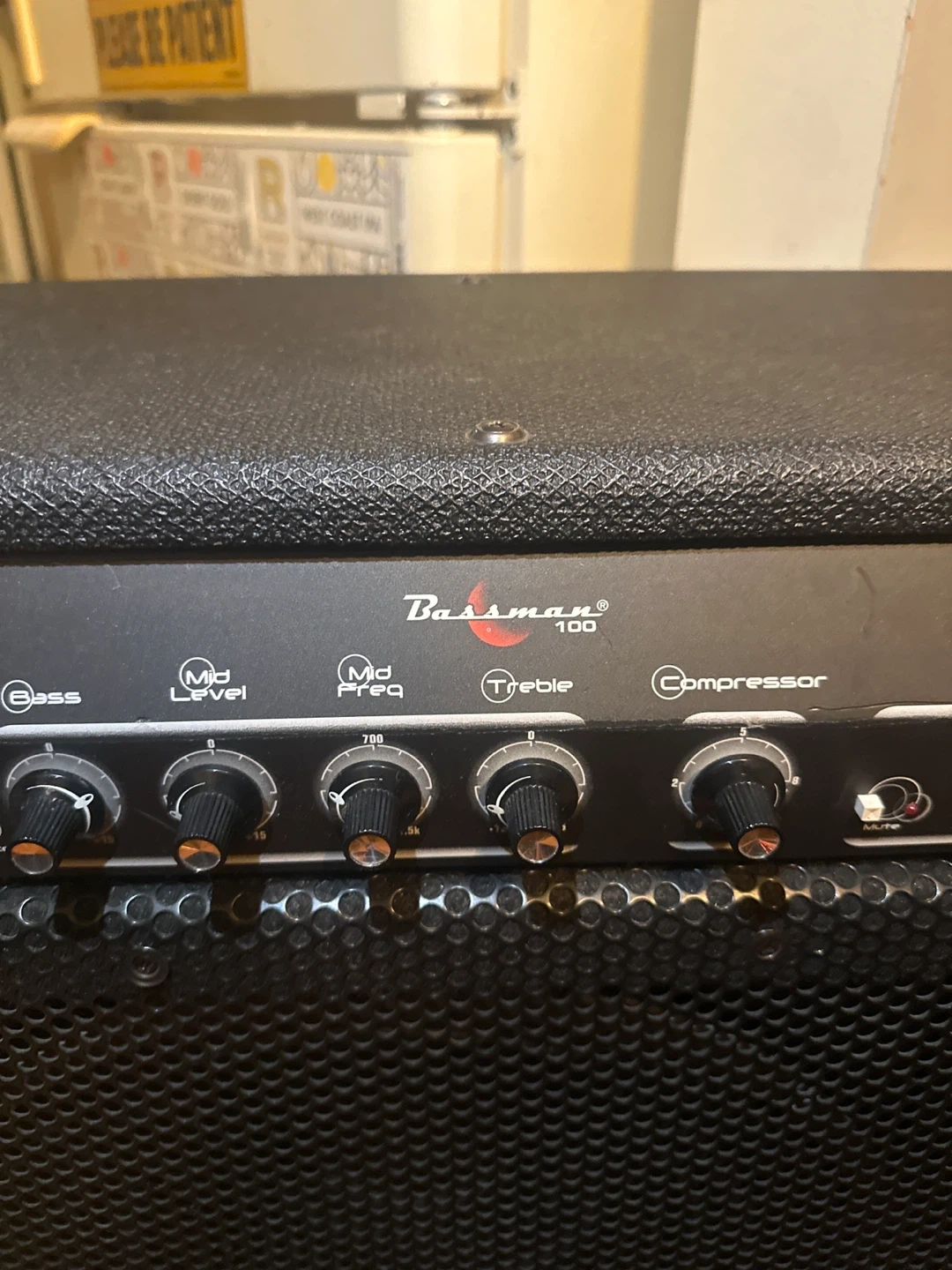 Open for offers, Fender Bassman 100 bass amplifier. It's in great shape and ready to rock! Features include bass, mid level, mid frequency, treble, and compressor controls. Perfect for practice or small gigs.