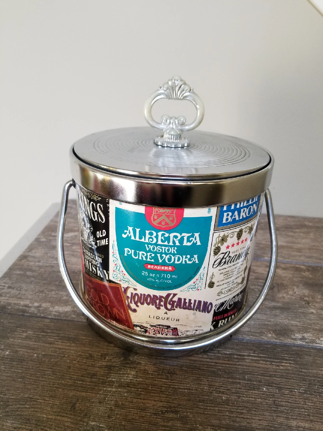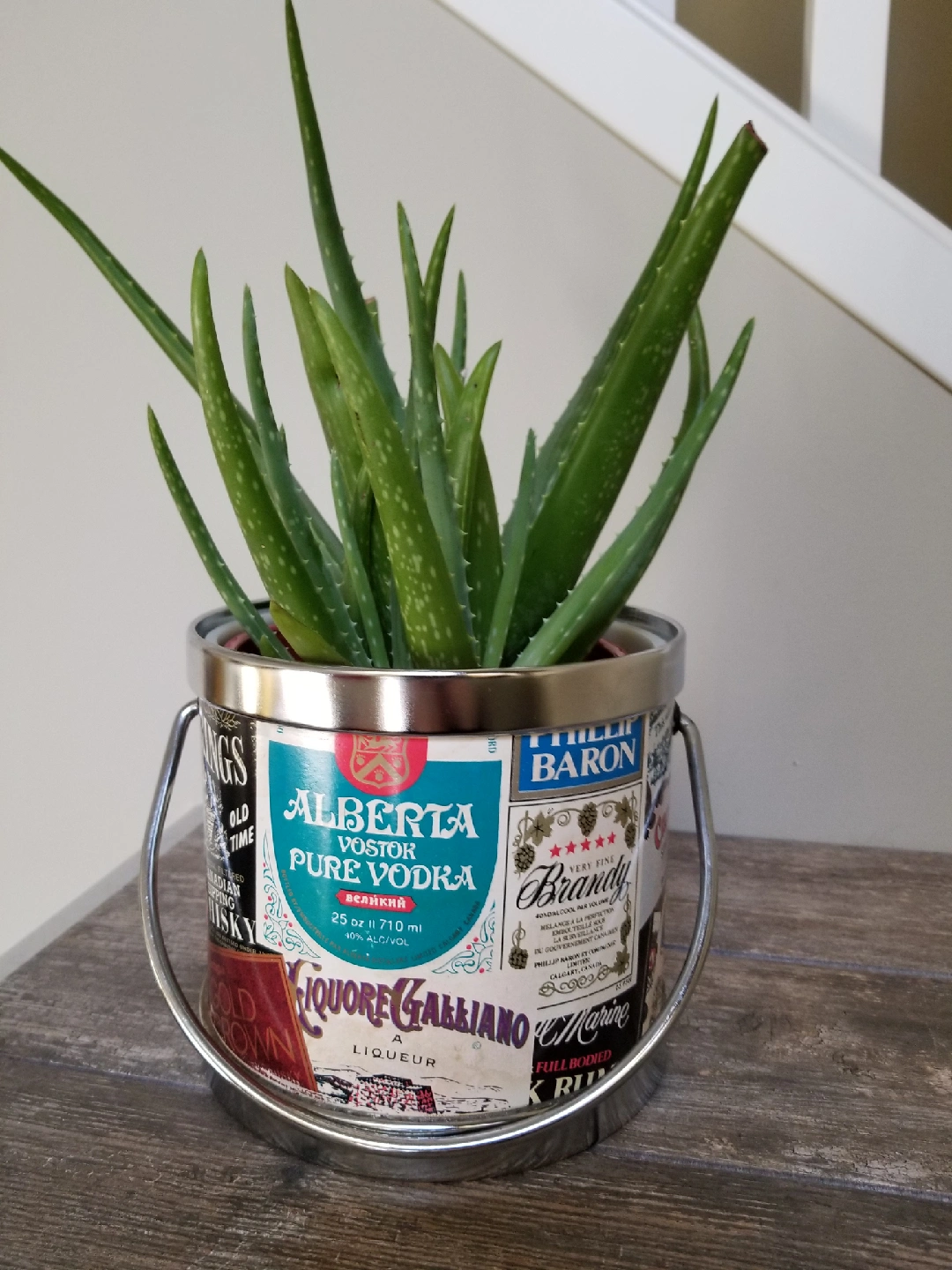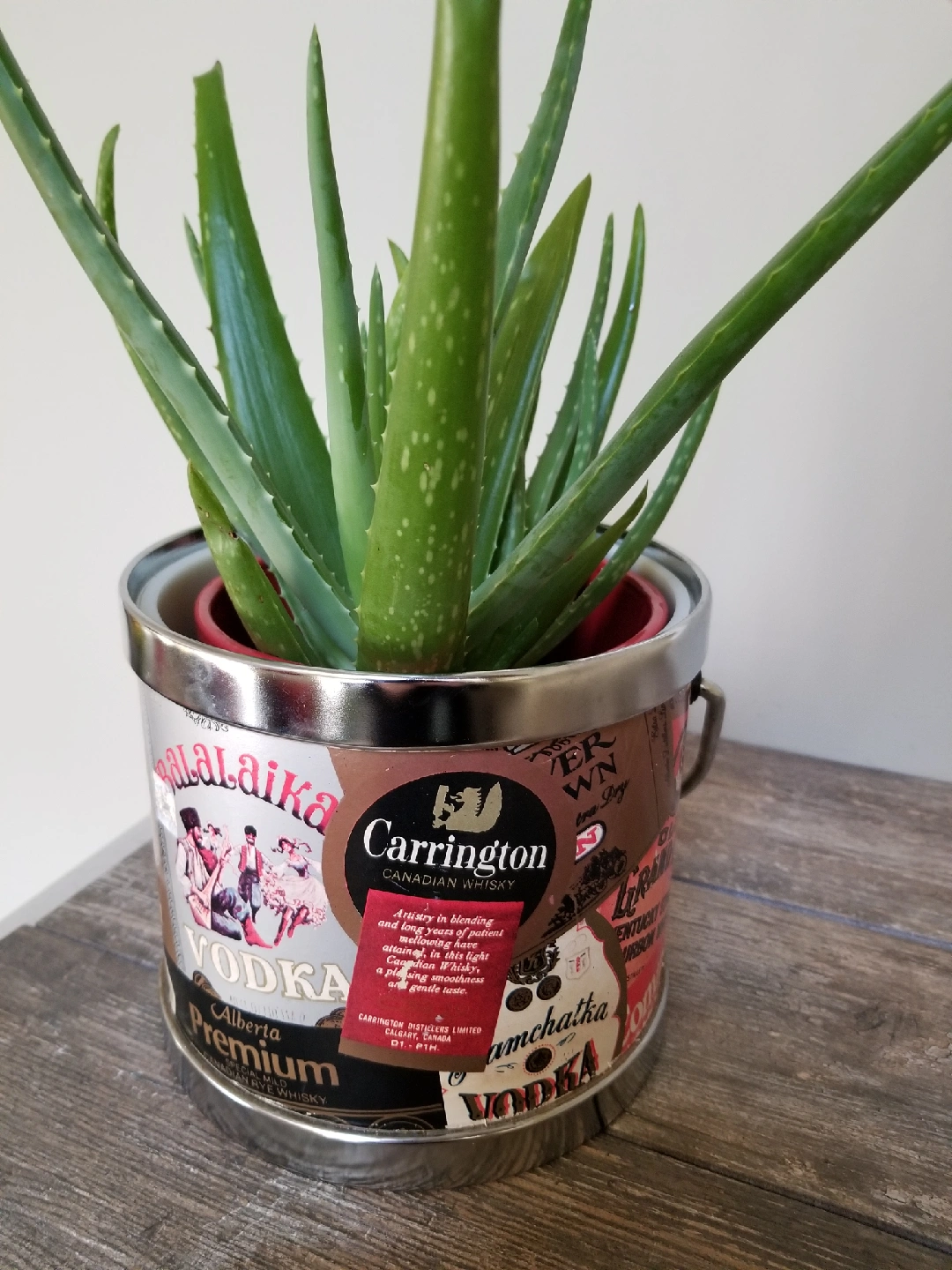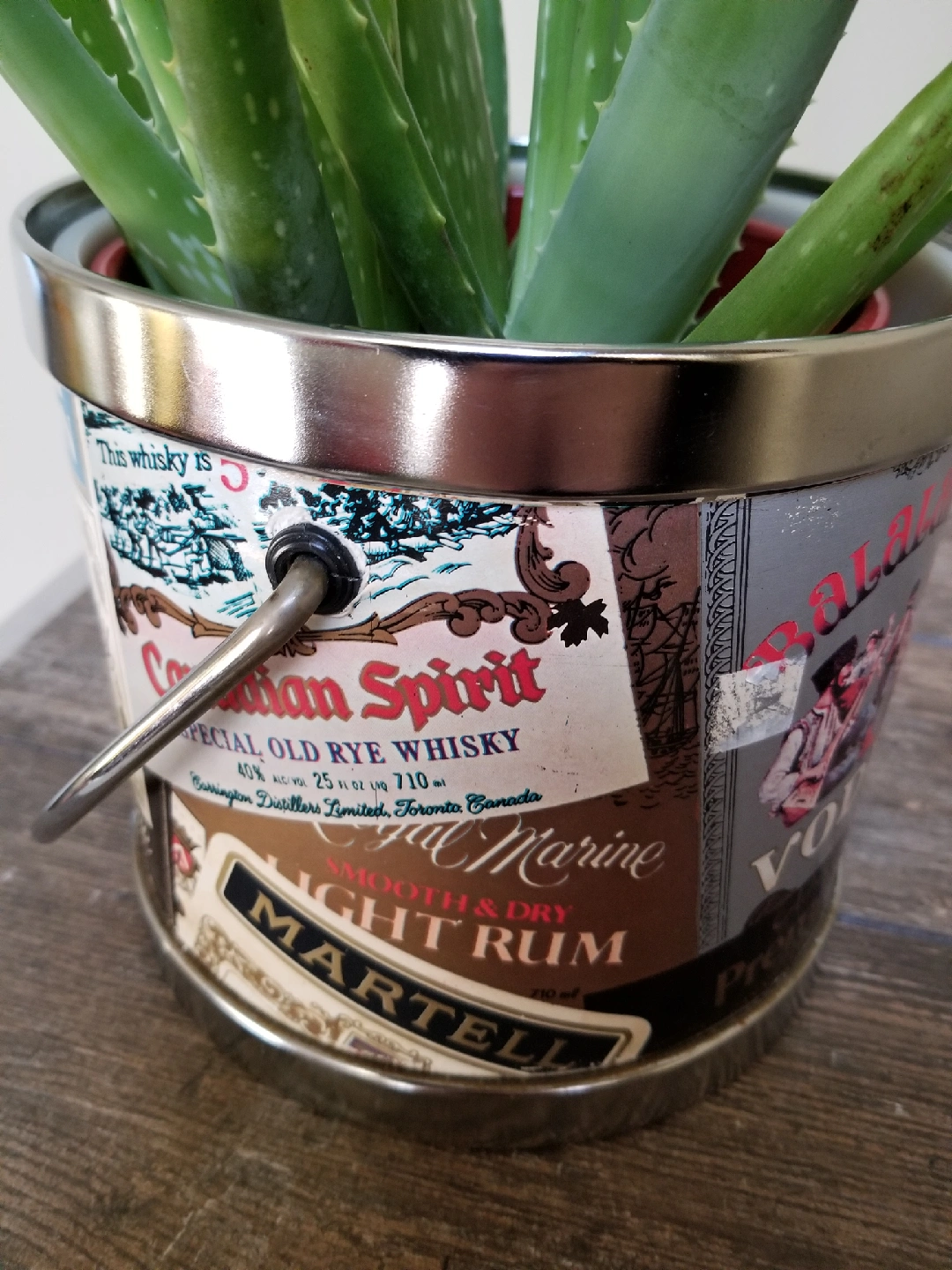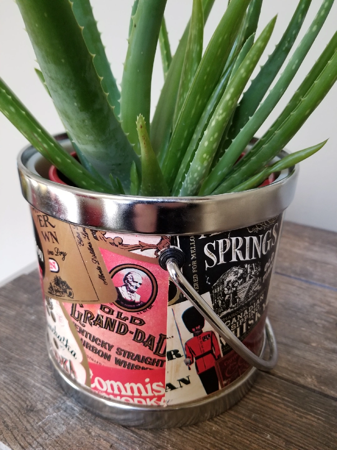 Unique upcycled plant pot featuring vintage liquor labels! This quirky planter adds a touch of retro charm to any space. Perfect for succulents, herbs, or your favourite houseplants. Get this delightful conversation starter for your home today! 7 inch diameter and 9 inches high.