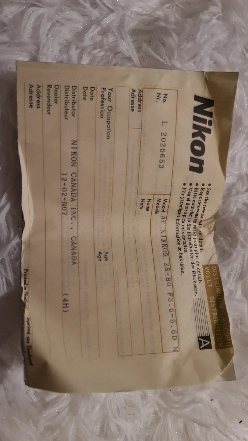 86Selling a Nikon AF Nikkor 28-80mm f/3.5-5.6D lens! It's in great shape and ready for a new home. Comes with the original box and warranty information.