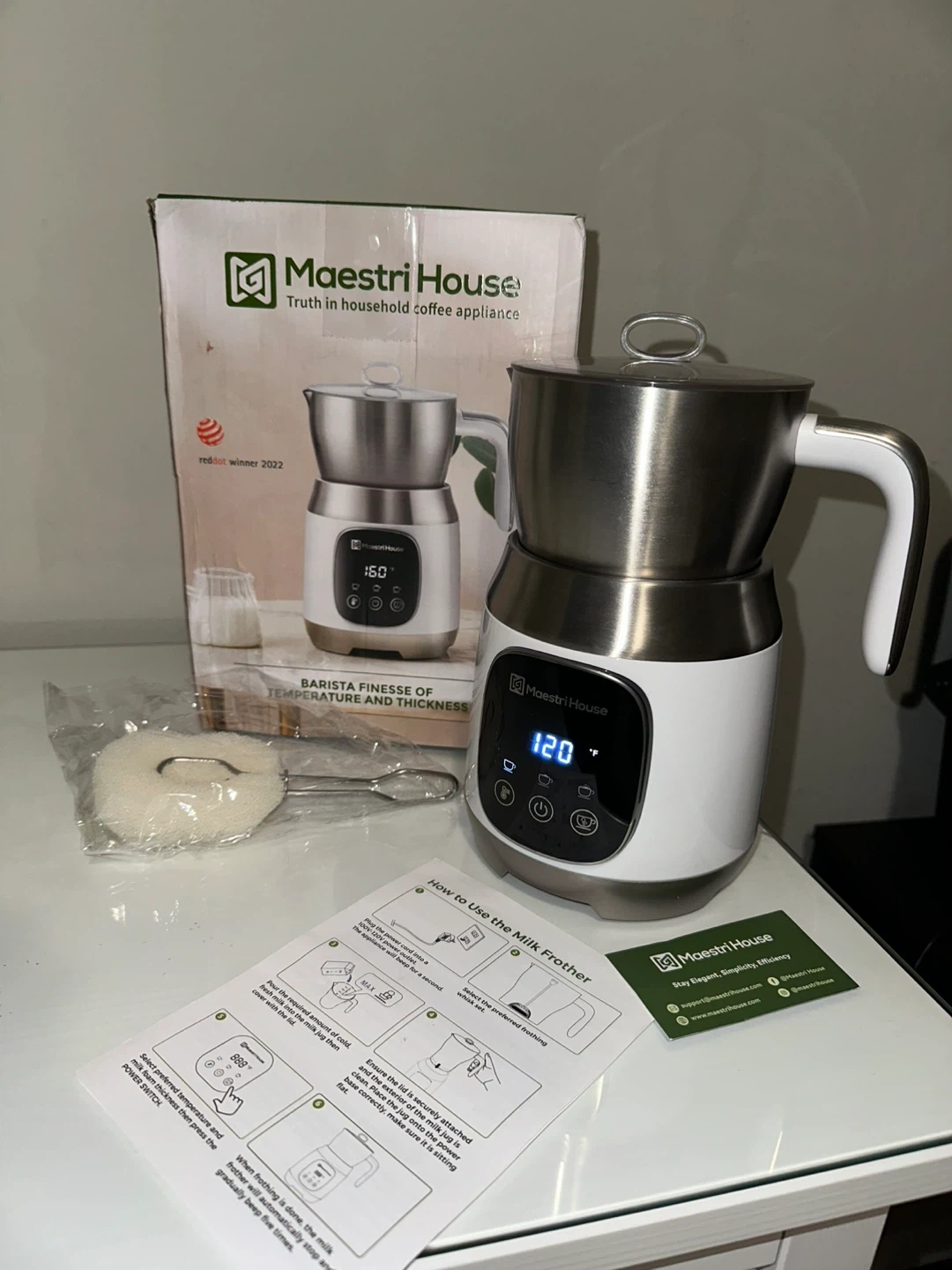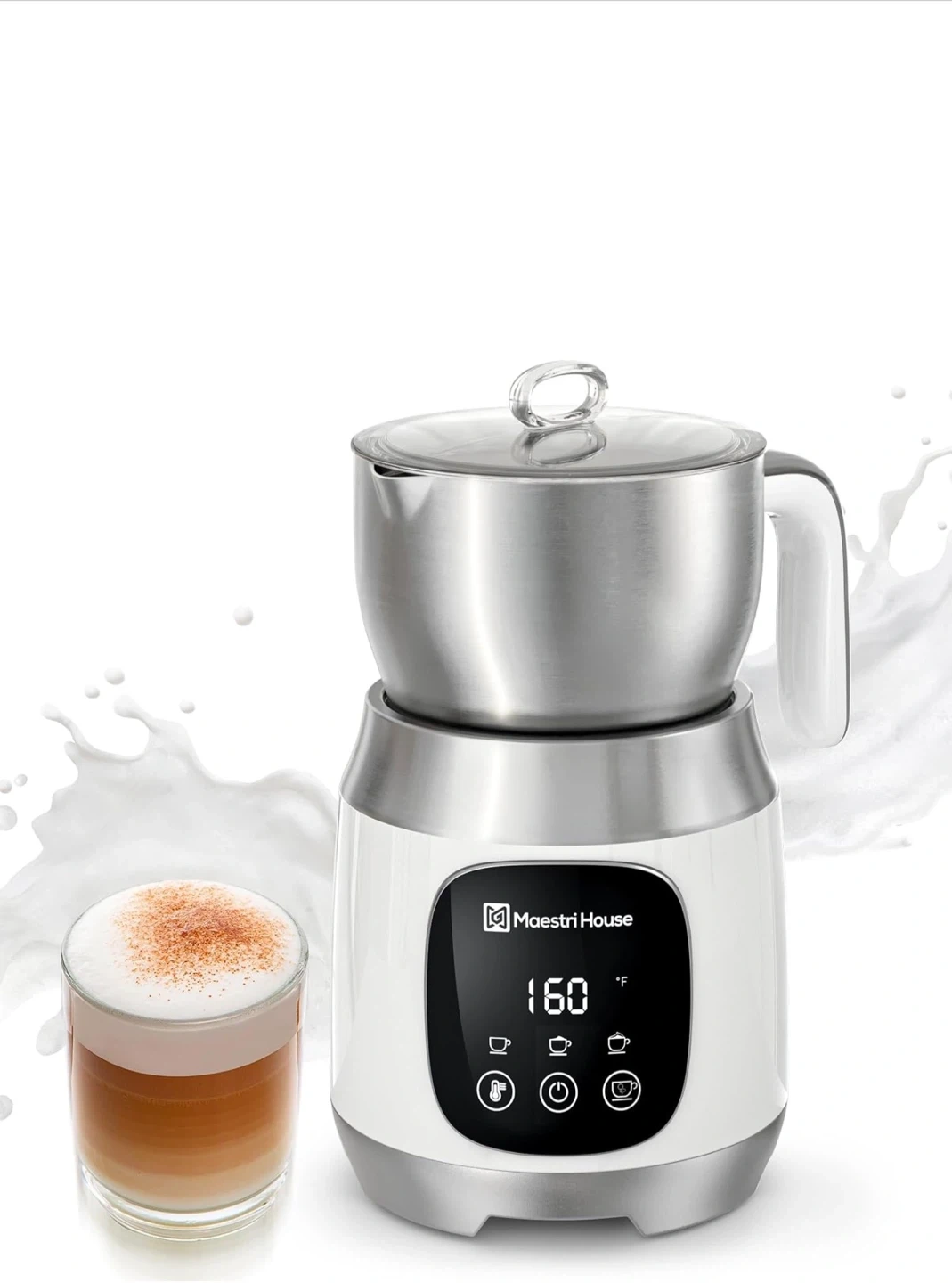 430I'm selling a Maestri House milk frother! It's in great condition and comes with the box and instructions. You can customize the thickness of your froth with low, medium, and high levels. It also features a smart touch control display for effortless operation