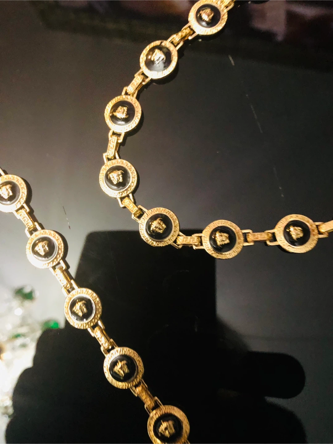 9Selling a beautiful Versace necklace and bracelet set in gold! The iconic Versace Medusa design is featured throughout both pieces. They are in great condition and would make a stunning addition to any jewelry collection