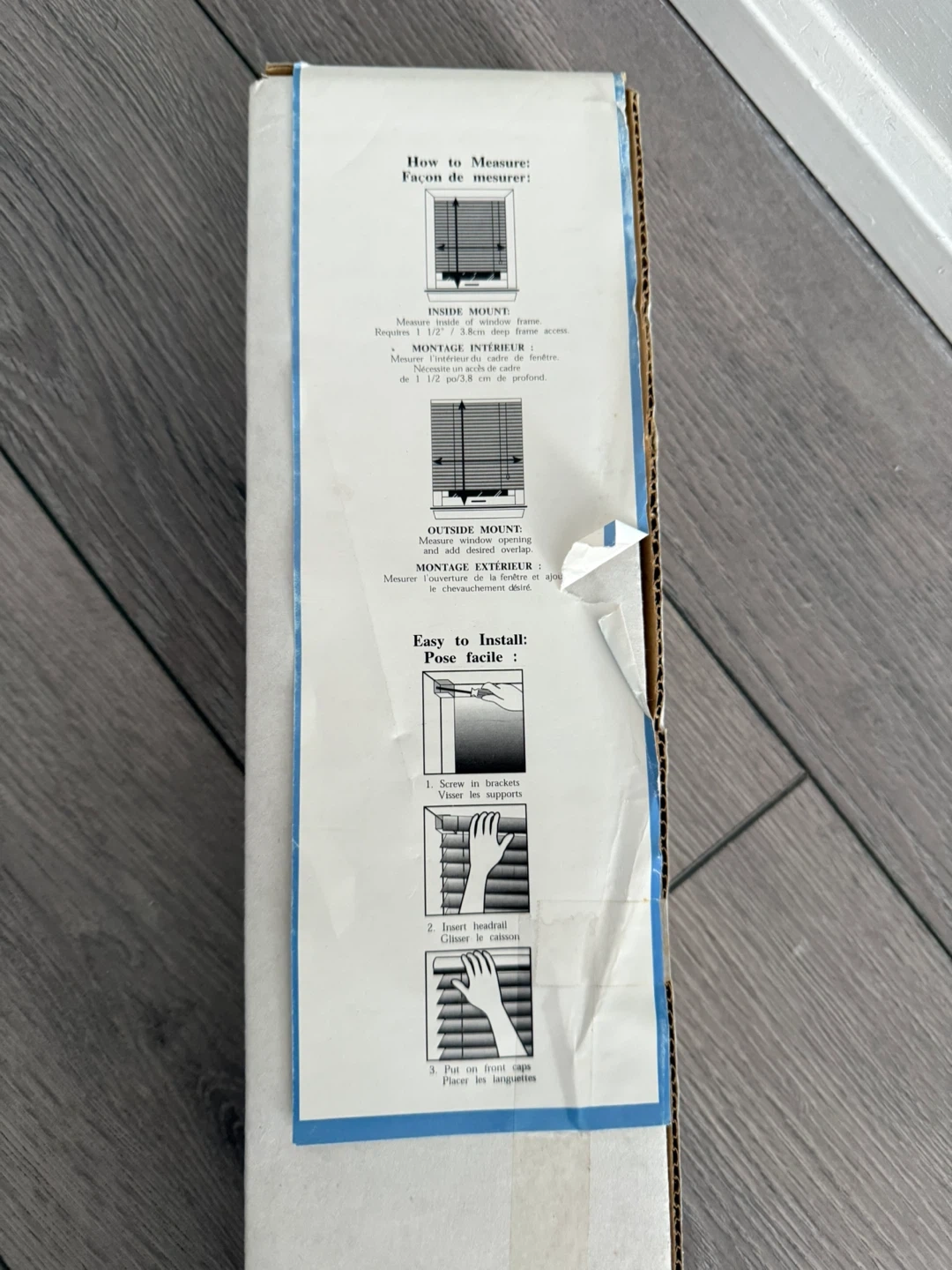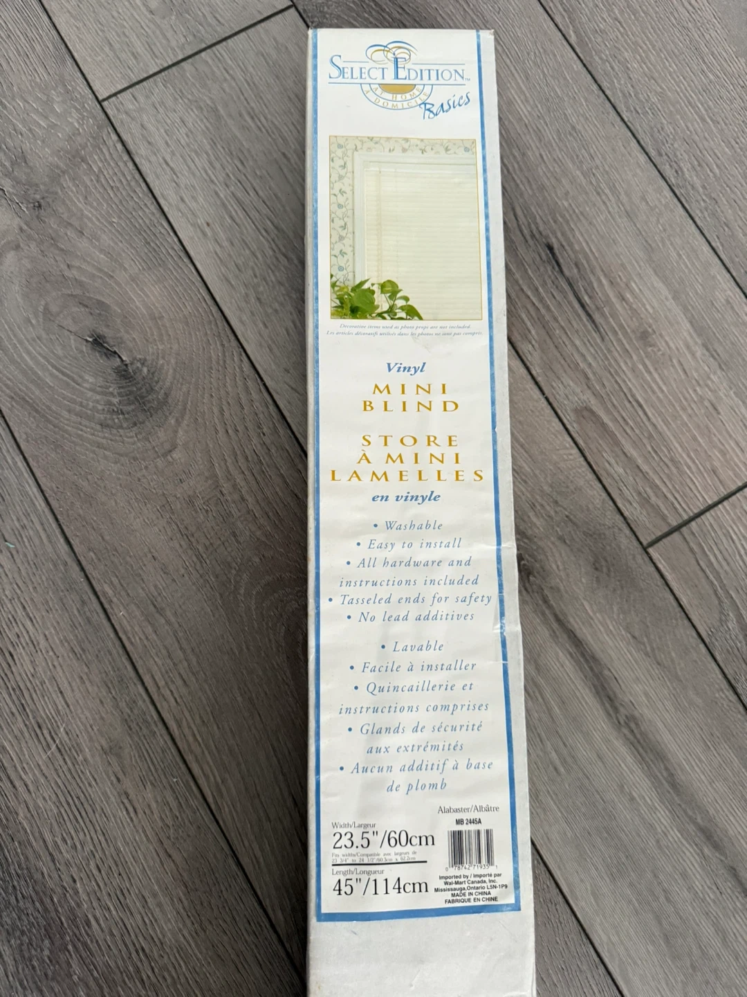 18Vinyl mini blind. It's 23.5 inches wide and 45 inches long. The box includes all hardware and instructions to install it.