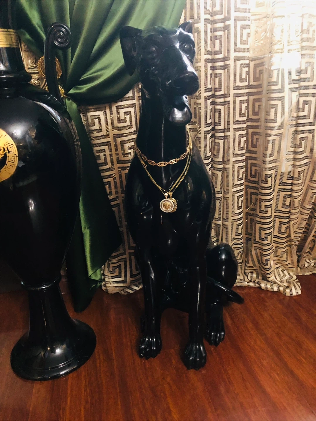 9Selling a striking Versace vase and a dog statue, both in sleek black. These pieces add a touch of luxury and sophistication to any room. The vase features the iconic Versace Medusa logo, while the dog statue is a unique and eye-catching decorative item