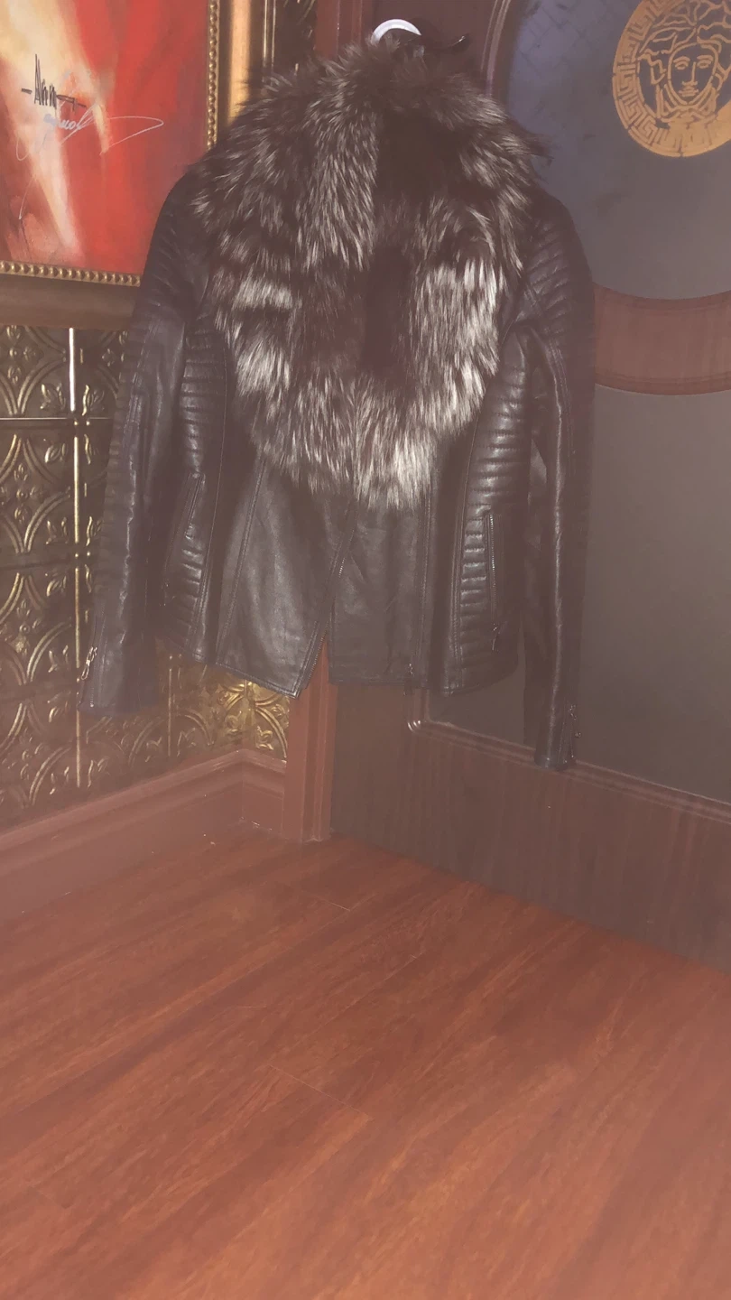 9Selling a stylish leather jacket featuring a striking fur collar. The jacket is black and appears to be in good condition. It's a fashionable piece that would add a touch of elegance to any outfit!