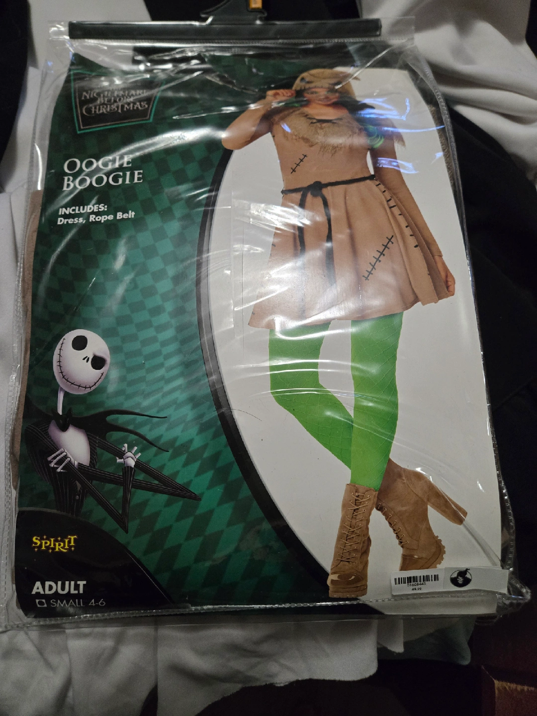 Selling an Oogie Boogie costume from The Nightmare Before Christmas! It's an adult size small (4-6). Includes the dress and rope belt. Brand is Spirit Halloween.