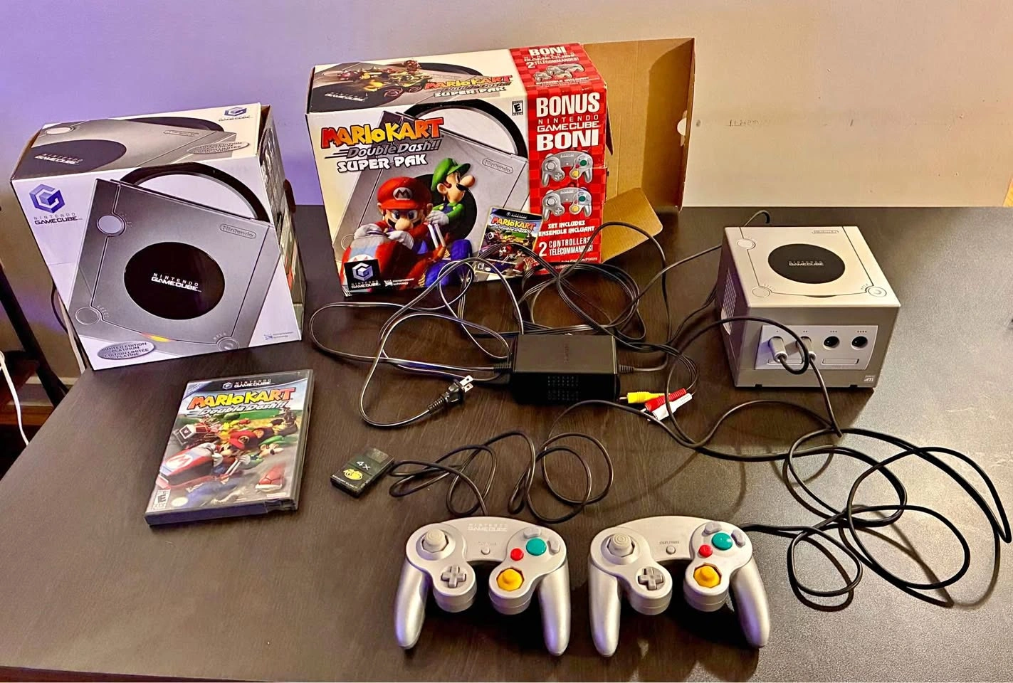 116Dive into nostalgic gaming with this rare Nintendo GameCube Platinum Edition bundle, complete with Mario Kart Double Dash game! This well-loved console is in good, used condition and ready to bring hours of retro fun. You'll get everything needed to start playing right away. This bundle has 2 controllers, and a memory card! Price is firm. If the ad's up, it's still available