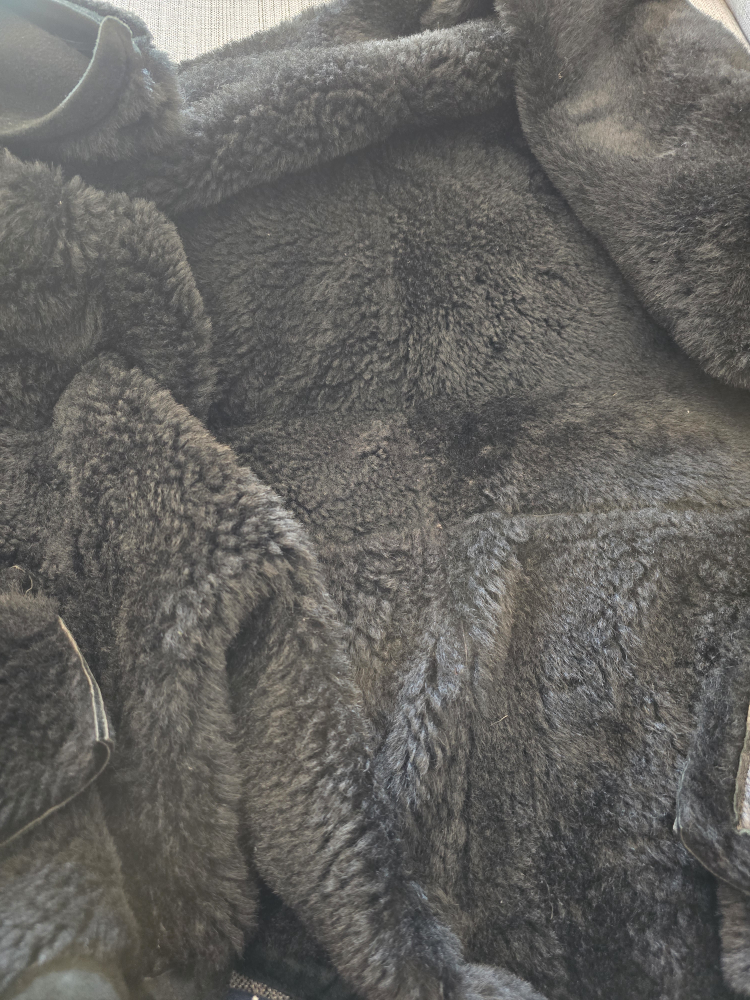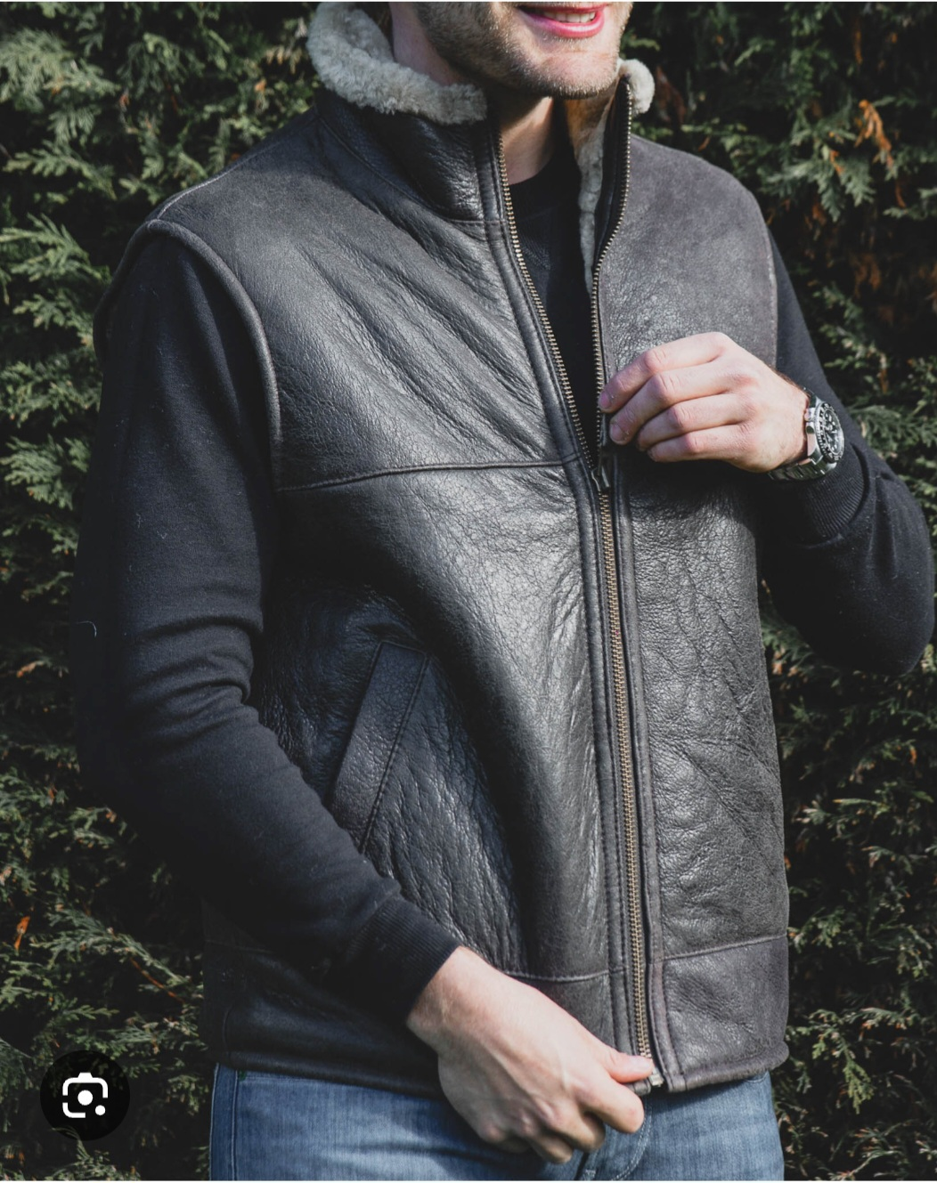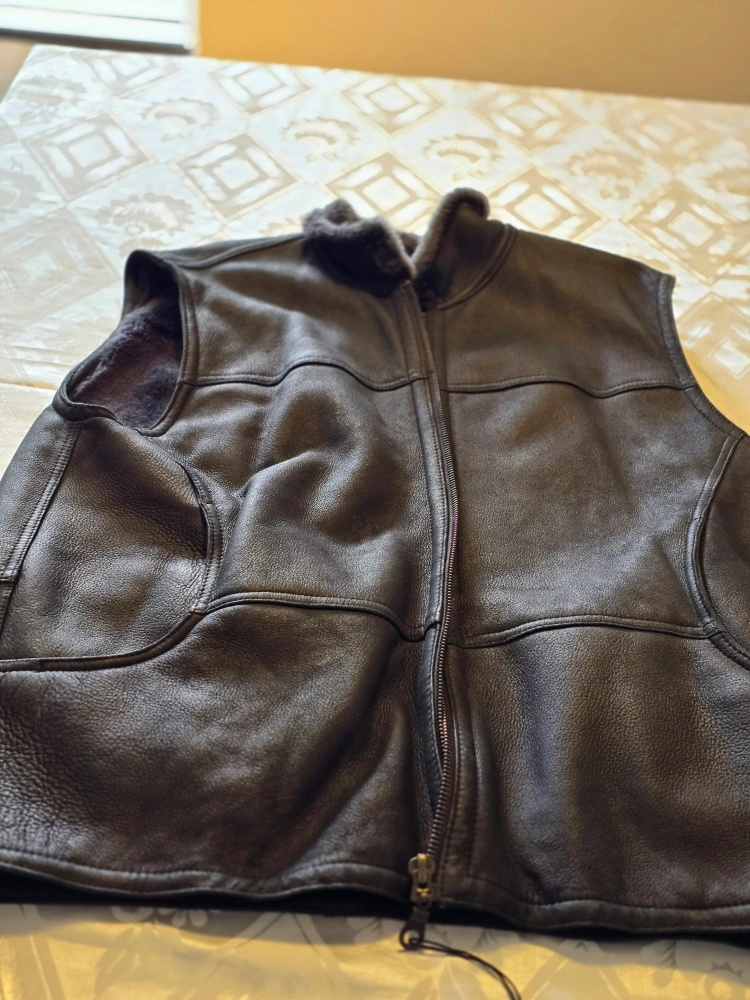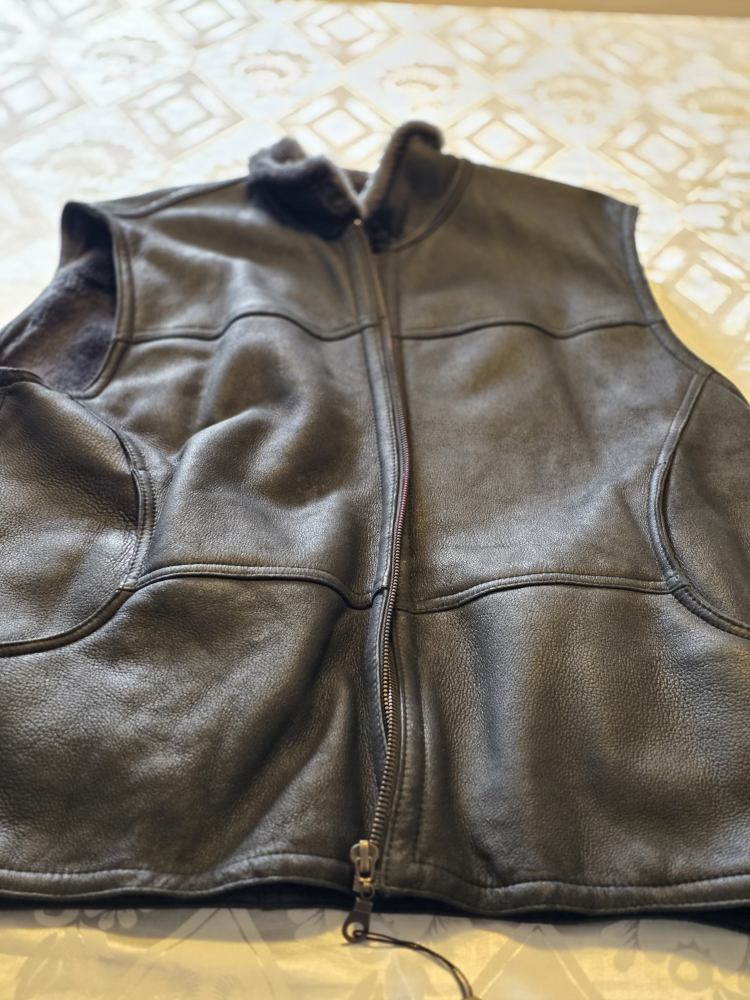 Selling a leather vest in black with a fur collar. It's in good condition and perfect for layering during the cooler months. The vest features a zipper closure and is made of genuine leather.