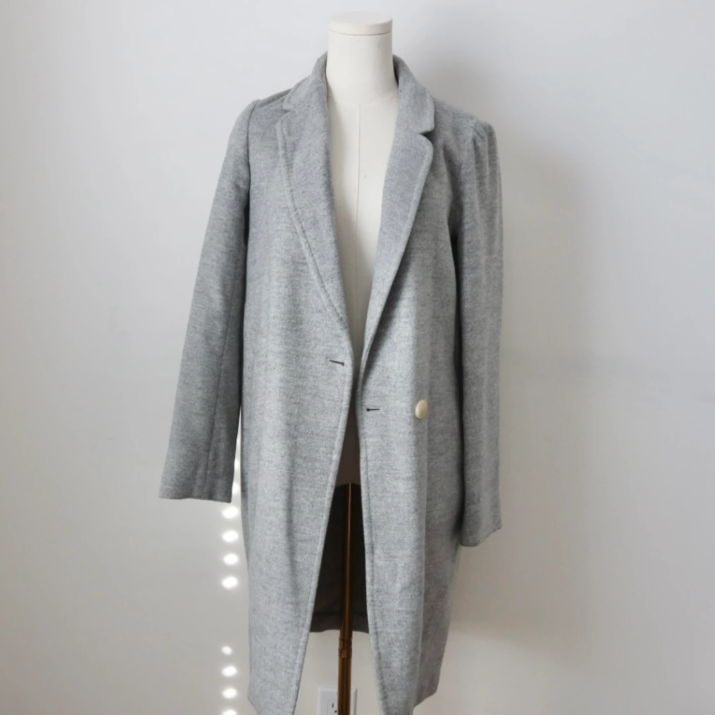 A stylish grey coat perfect for layering! The wool blend material makes it warm and comfortable for cooler weather. It's in great condition and ready for a new home. A versatile addition to any wardrobe!