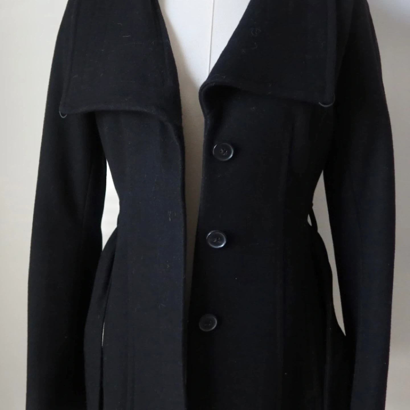 Selling a lovely black wool coat from Babaton Atelier! It's in great condition and a size XS. Perfect for keeping warm and stylish during the colder months. The coat features a flattering silhouette and a tie around the waist