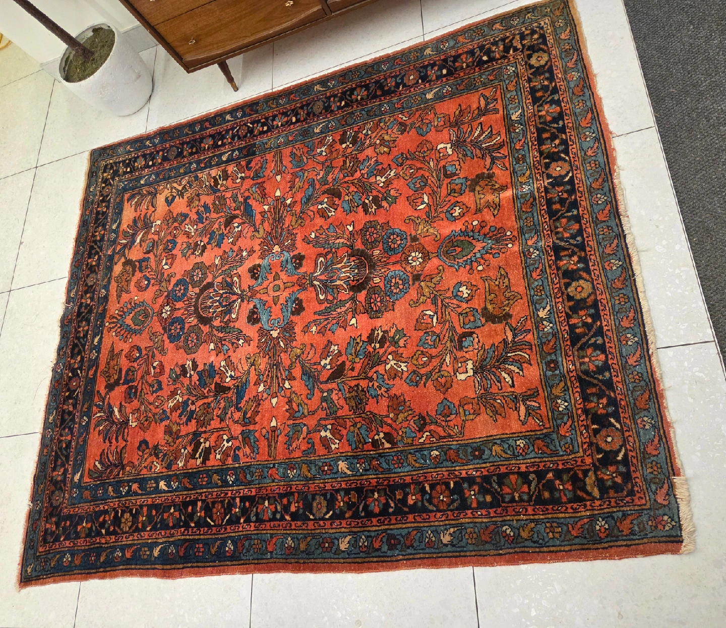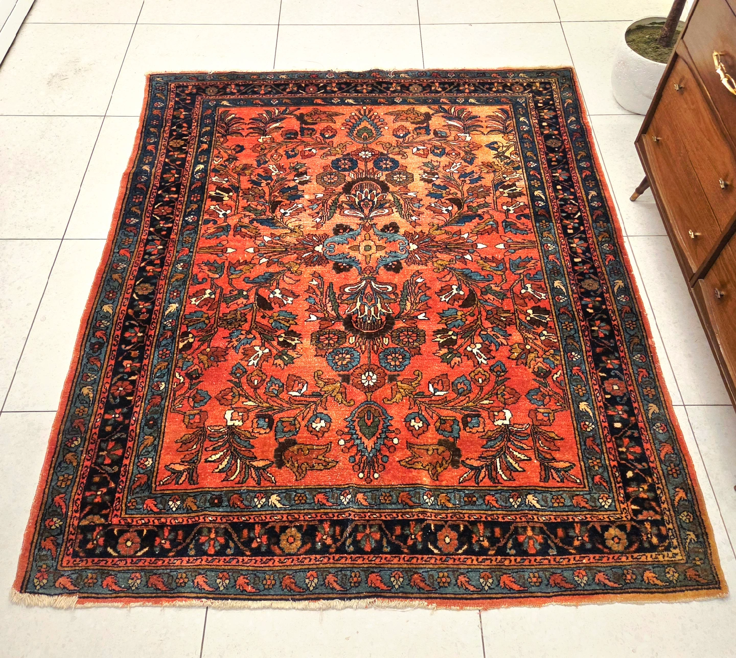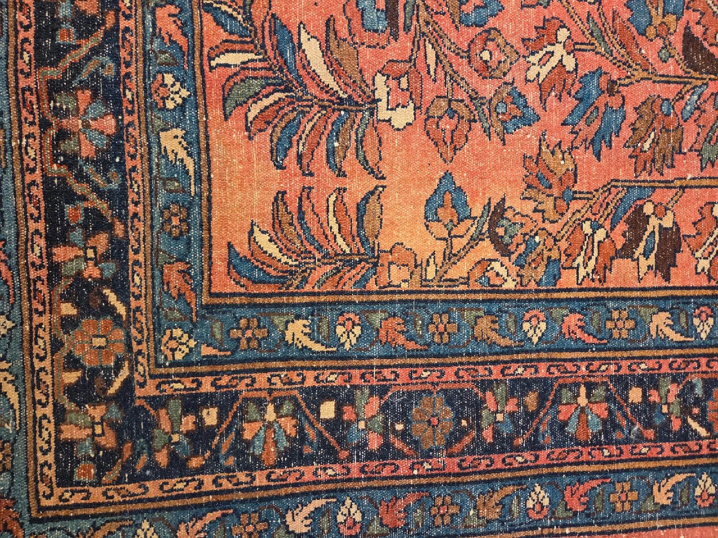 Antique hand knotted Persian Sarouk wool area rug with incredible fine patterns and vibrant pallette of colors masterfully hand knotted. After some extensive research all roads point to that this rug dates back to the early 20th century. The condition of the rug supports this theory but overall it held up incredible well over the decades. The manufacturer label on the backside has been removed so the manufacturer and the date of production stated above is primarily based on my research. For any additional questions or photos please don't hesitate to reach out.